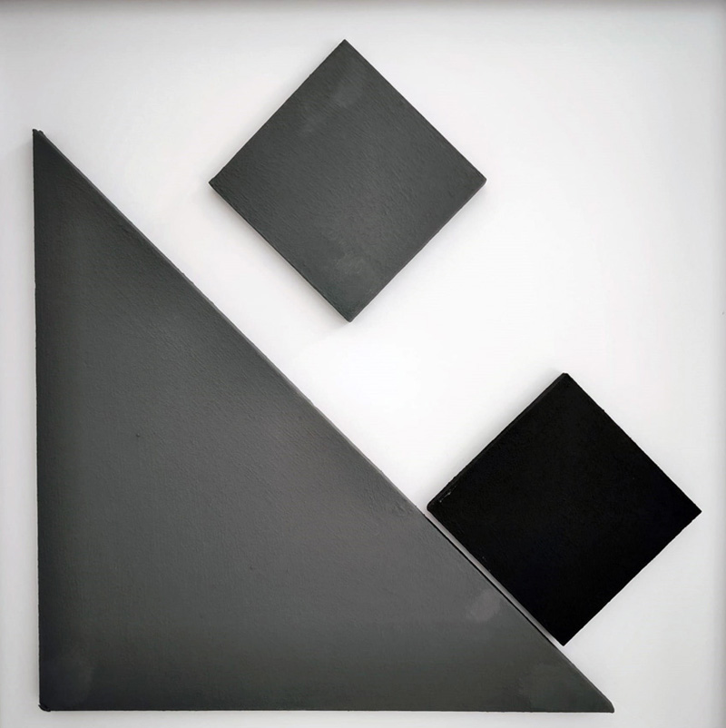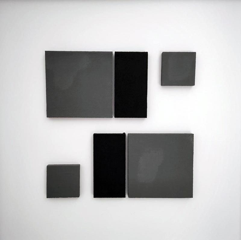 Stefano Paulon esplicita la propria narrazione invece attraverso la materia, Utilizza principalmente legno e cartone sulle cui superficie poi interviene con finiture cementizie a base acrilica che utilizza per dar vita a forme geometriche proposte solitamente in modalità installativa o, come in questa occasione, inserite nei limiti di quadri/contenitori che divengono affaccio sul suo mondo artistico.