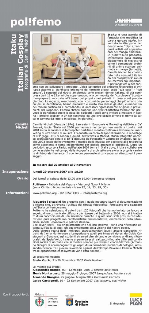 Giovani donne italiane, di età compresa tra i 18 i 33 anni che appartengono alla community dei “cosplayers” (costume+players), mostrate all’interno dei propri spazi privati, mascherate con i costumi dei personaggi che più amano o in cui più si identificano