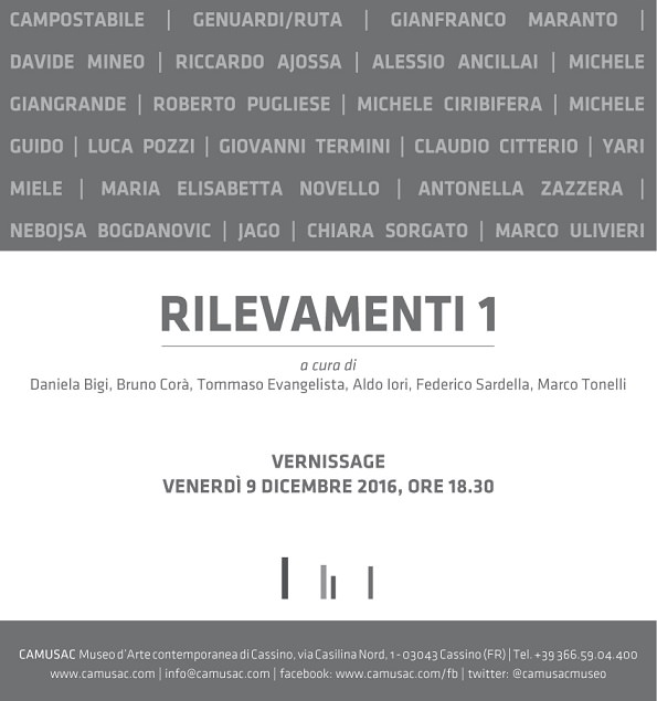 Dopo il significativo evento dedicato all'opera di Nicola Carrino, uno dei protagonisti di spicco dello storico Gruppo Uno di Roma, venerdì 9 dicembre 2016, a partire dalle ore 15,30 e fino alle 20,00, è in programma presso il CAMUSAC l'apertura della mostra “Rilevamenti # 1”, ideata e progettata da Bruno Corà in collaborazione con Daniela Bigi, Tommaso Evangelista, Aldo Iori, Federico Sardella e Marco Tonelli che hanno individuato, ognuno con proprie indicazioni critiche, i primi cinque nuclei di artisti invitati in questa rassegna.