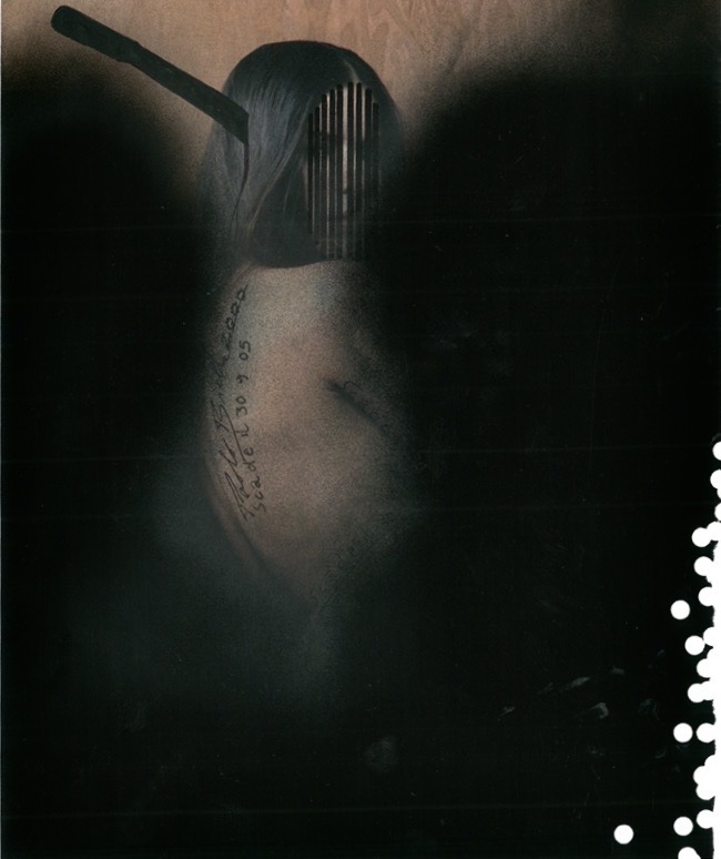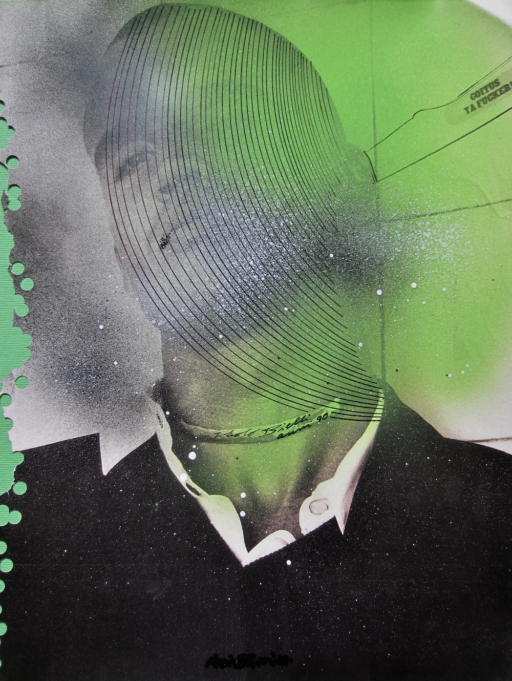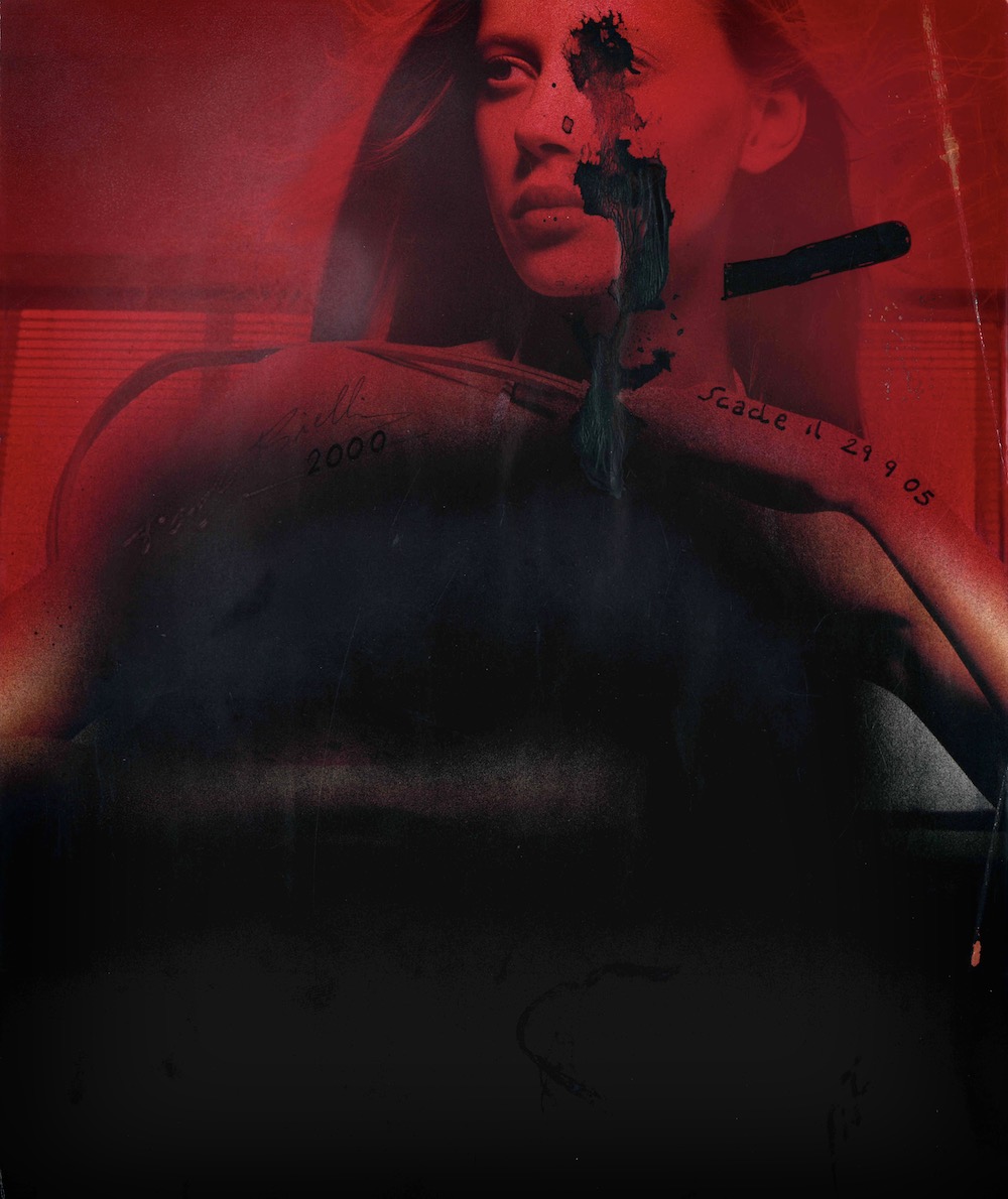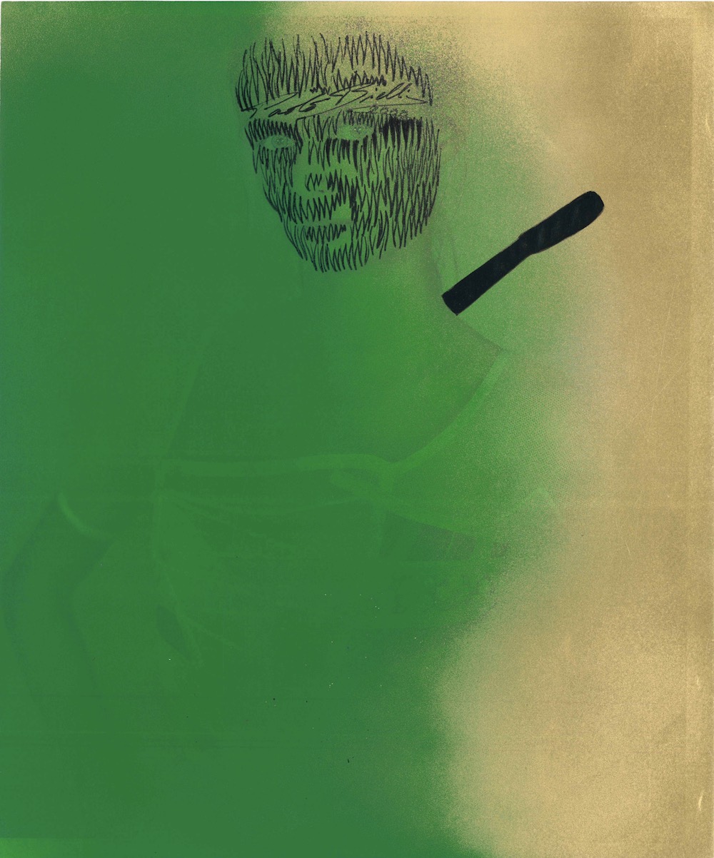 Ritrova l’immagine del coltello simbolo di un oggetto conturbante che buca con la sua sagoma la carta stampata delle riviste. Senza andare a violentare le figure che ancora impassibili sembrano non accorgersi di nulla.