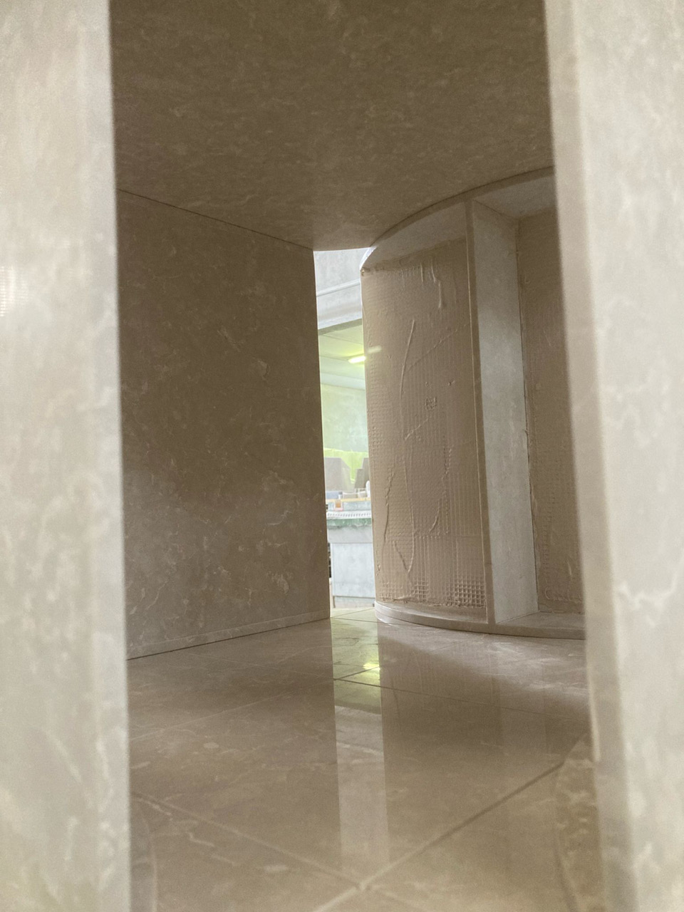 Con CHAPEL MMXXV di Massimo Chiappetta entriamo nel campo della scultura, con un’opera che rappresenta una meditazione plastica sull’origine della stanza come forma simbolica. Corpo e spazio, pieno e vuoto, curvo e retto, solido e aereo, interno ed esterno, aperto e chiuso, luce e ombra, presenza e assenza, formano le coppie elementari che fanno emergere il processo generativo e compositivo nel circolo del dialogo tra Terra e Cielo. La pietra, la lastra di marmo botticino, trattiene il retto, la massa di terra cruda, plasmata in contrappunto, mostra il convesso e questa combinazione permette l’abitare dell’essere pensante.