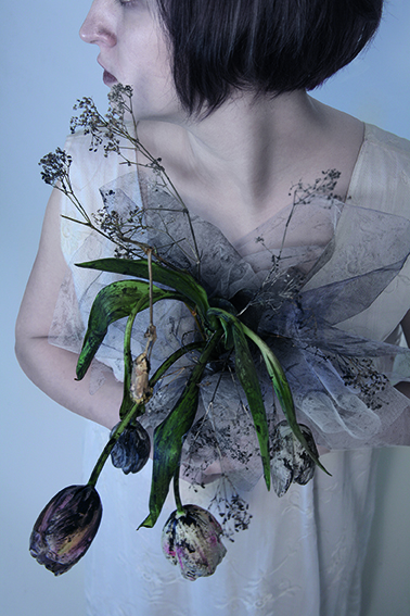 I fiori appassiti, dal gambo spezzato incarnano da sempre il concetto di caducità, una bellezza effimera e dunque subitaneamente svanita, una serenità compromessa, soli nell'eloquenza laconica di un'atmosfera circonfusa di silenzio e immota sospensione. Ma questi oggetti vivi aggrediti dal tempo, ontologicamente corruttibili, di una straordinaria qualità tattile, dagli studiati, funerei cromatismi, non creano una melodica meditazione sulla morte nemmeno quando sono sospesi contro il vigore di giovani corpi senza volto, mute presenze fisiche fuori fuoco che non lasciano trapelare emozioni né sprigionano desiderio, giustapposti ad arti feriti e sanguinanti, confrontati con la malinconica delicatezza di spose dai bouquet avvizziti.