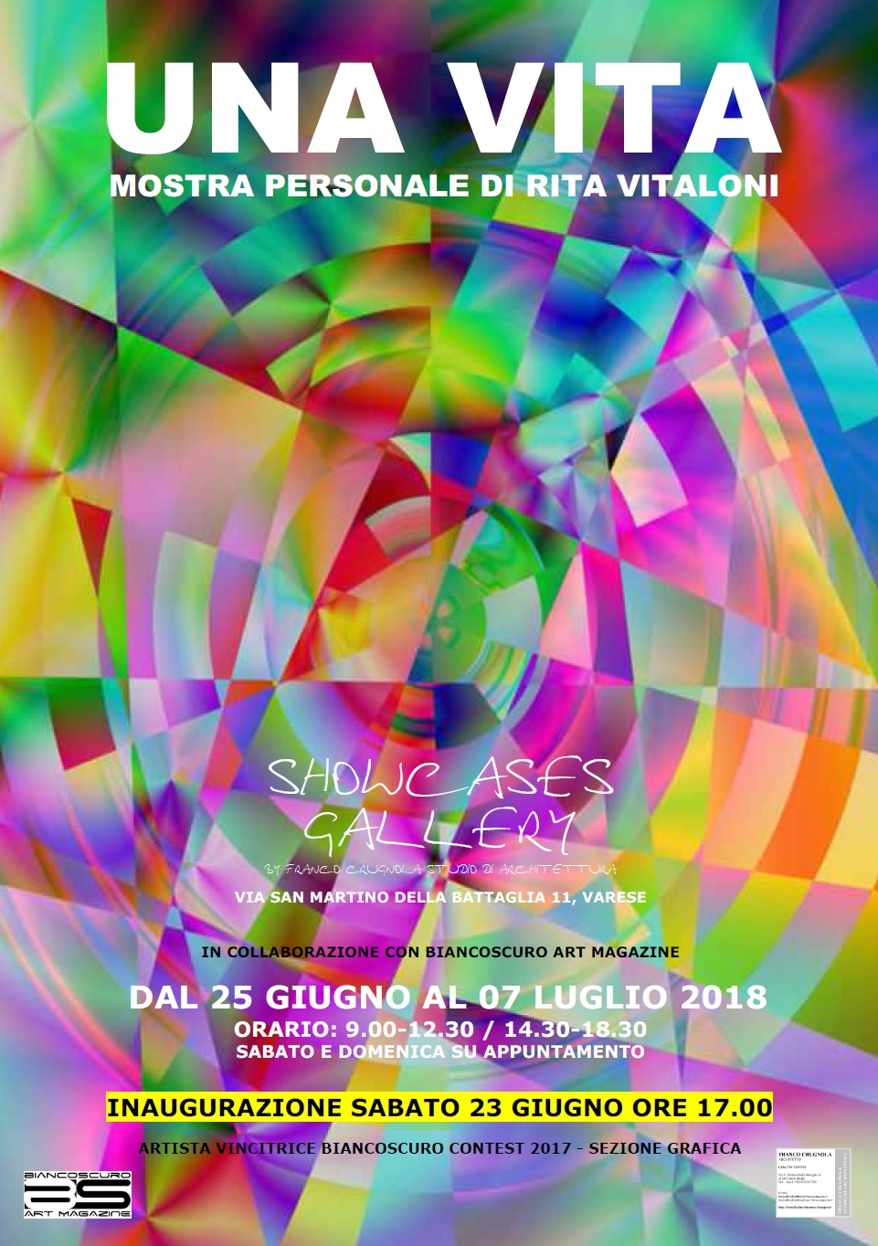 Dal 25 giugno al 07 luglio 2018, SHOWCASES GALLERY (Via San Martino della Battaglia 11, Varese) ospita la mostra “UNA VITA” - personale di Rita Vitaloni, curata da Franco Crugnola, con catalogo curato da Vincenzo Chetta. L’esposizione, promossa da “Franco Crugnola Studio Di Architettura” di Varese, rientra nella collaborazione con il BIANCOSCURO ART CONTEST 2017: Rita Vitaloni è stata una dei vincitori del concorso nella SEZIONE GRAFICA.