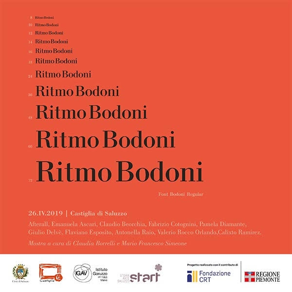 l'Istituto Garuzzo per le Arti Visive inaugura venerdì 26 aprile, all'interno degli spazi della sua Collezione permanente ospitata nella Castiglia di Saluzzo, Ritmo Bodoni a cura di Claudia Borrelli e Mario Francesco Simeone. La mostra di arte contemporanea si inserisce all'interno della manifestazione Start/Storia e Arte a Saluzzo che, per l'edizione 2019, avrà per tema il "carattere".