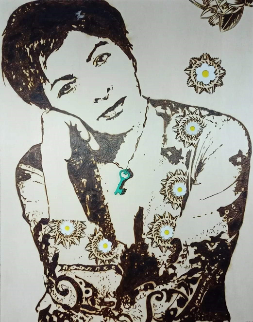 È insegnante di Pirografia e Piroincisione. Questa tecnica, “a fuoco” con la quale incide i suoi disegni non solo si traduce in opere puramente originali ma conferisce anche un altro strato di simbologia e significato a ciascuna immagine.