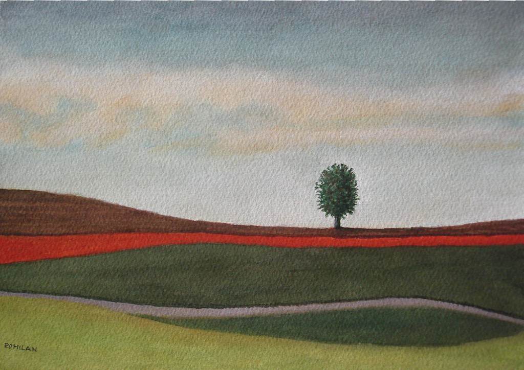 Sono sempre stato convinto che i paesaggi, le vedute, le nature di Ro Milan fossero in verità dei ritratti. Ancor più e meglio gli alberi, che ad un tempo interpretano il ruolo di personaggi maestosi e di indicatori del territorio. Con i dipinti dell’ultimo periodo Ro Milan svela che il suo approccio alla natura, se da una parte alimenta atmosfere arcane, dall’altra mira proprio a individuare e ricreare pittoricamente i tratti distintivi, e possiamo dire la personalità di presenze abituali, solo all’apparenza minori e men che meno insignificanti: una conchiglia, una foglia, un frutto, l’albero, le colline, il cielo, le nuvole… A tutti riserva un’aura di identità e di mistero, di colore e di sottile poesia. D.A.