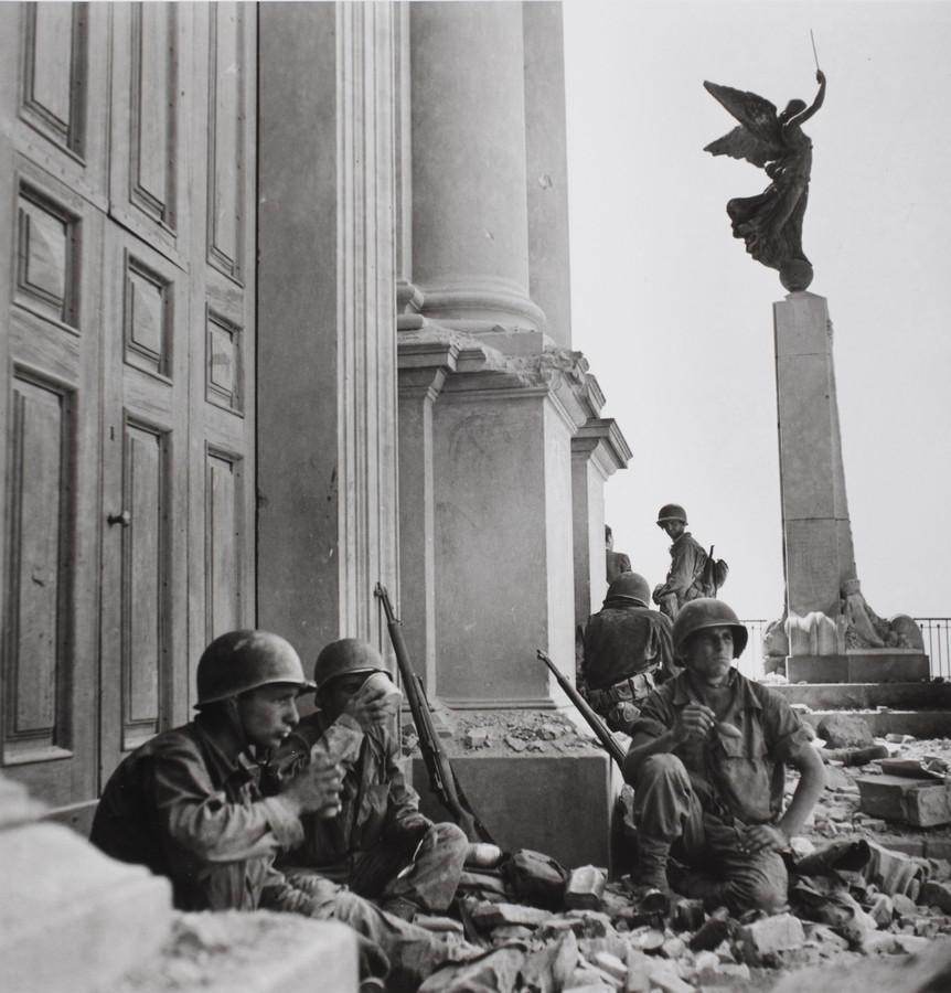 Ed è così che Capa racconta la resa di Palermo, la posta centrale di Napoli distrutta da una bomba ad orologeria o il funerale delle giovanissime vittime delle famose Quattro Giornate di Napoli. E ancora, vicino a Montecassino, la gente che fugge dalle montagne dove impazzano i combattimenti e i soldati alleati accolti a Monreale dalla gente o in perlustrazione in campi opachi di fumo, fermo immagine di una guerra dove cercano – nelle brevi pause – anche il recupero di brandelli di umanità.