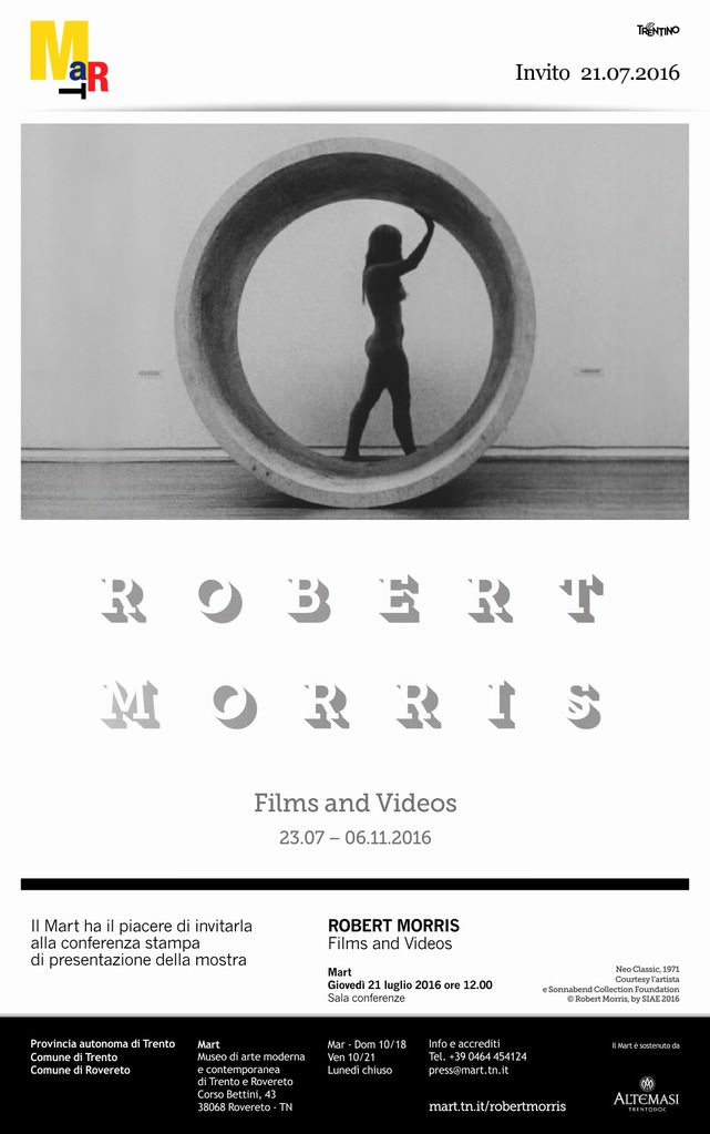 Il Mart presenta la prima mostra antologica italiana dedicata ai film e ai video di Robert Morris (Kansas City, 1931). Tra le figure chiave dell’arte del ‘900, sia per l’operato artistico, sia per la centralità dei testi programmatici, ingegnere di formazione, Morris concentra la sua ricerca sulle proprietà espressive elementari della materia: il peso, il volume, la forma determinata dalla gravità.