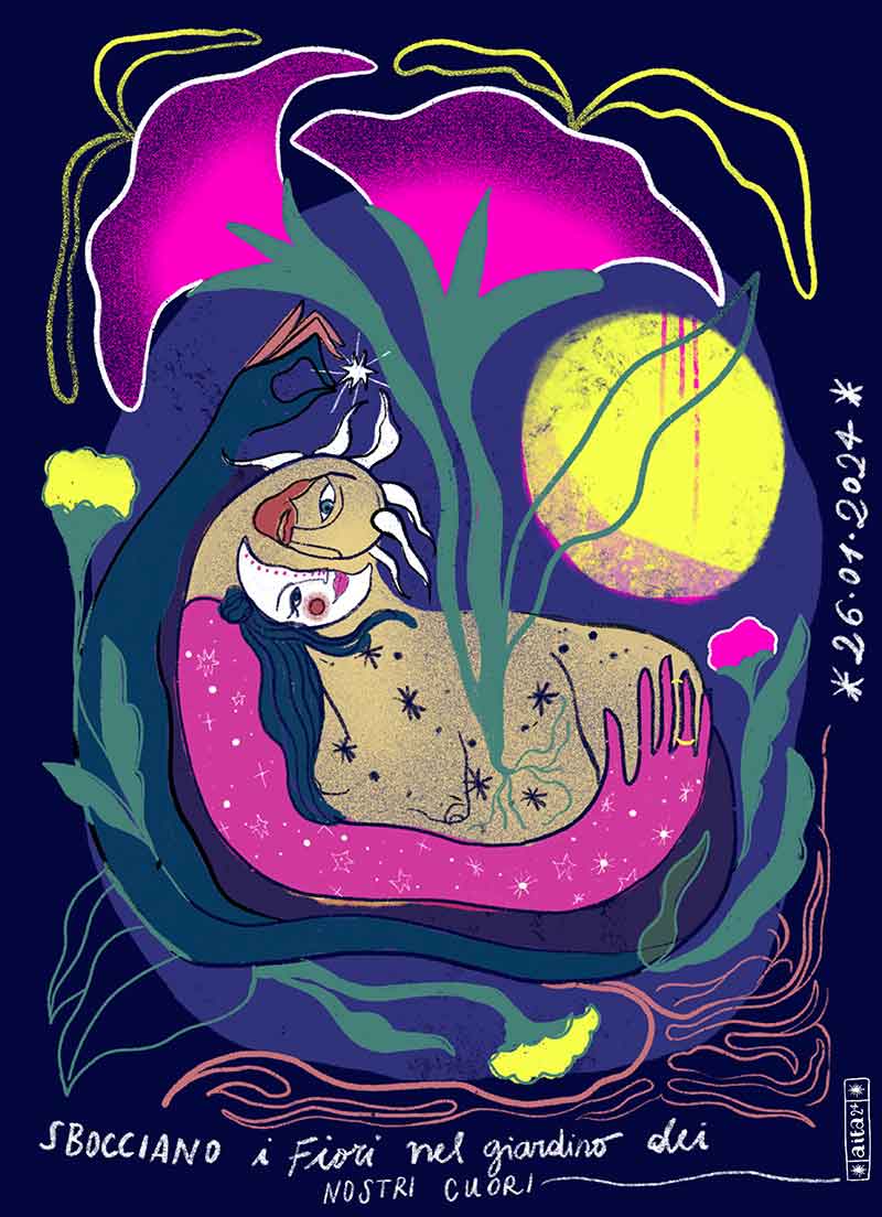 L’artista Roberta Aita espone per la prima volta a Reggio Emilia con la personale “Le stelle di dentro, i sogni di fuori”. La mostra comprende una selezione di 16 opere tra disegni originali e illustrazioni digitali che vogliono rappresentare un viaggio emozionale, cercando di connettere il dentro e il fuori, le emozioni interne e la realtà esterna, la correlazione tra materia umana e quella universale. L’esistenza umana diventa come un portale, un mezzo per accedere alle grandi verità, e la realtà solo un pretesto per avvicinarsi ai sogni che vengono visti come una dimensione parallela.