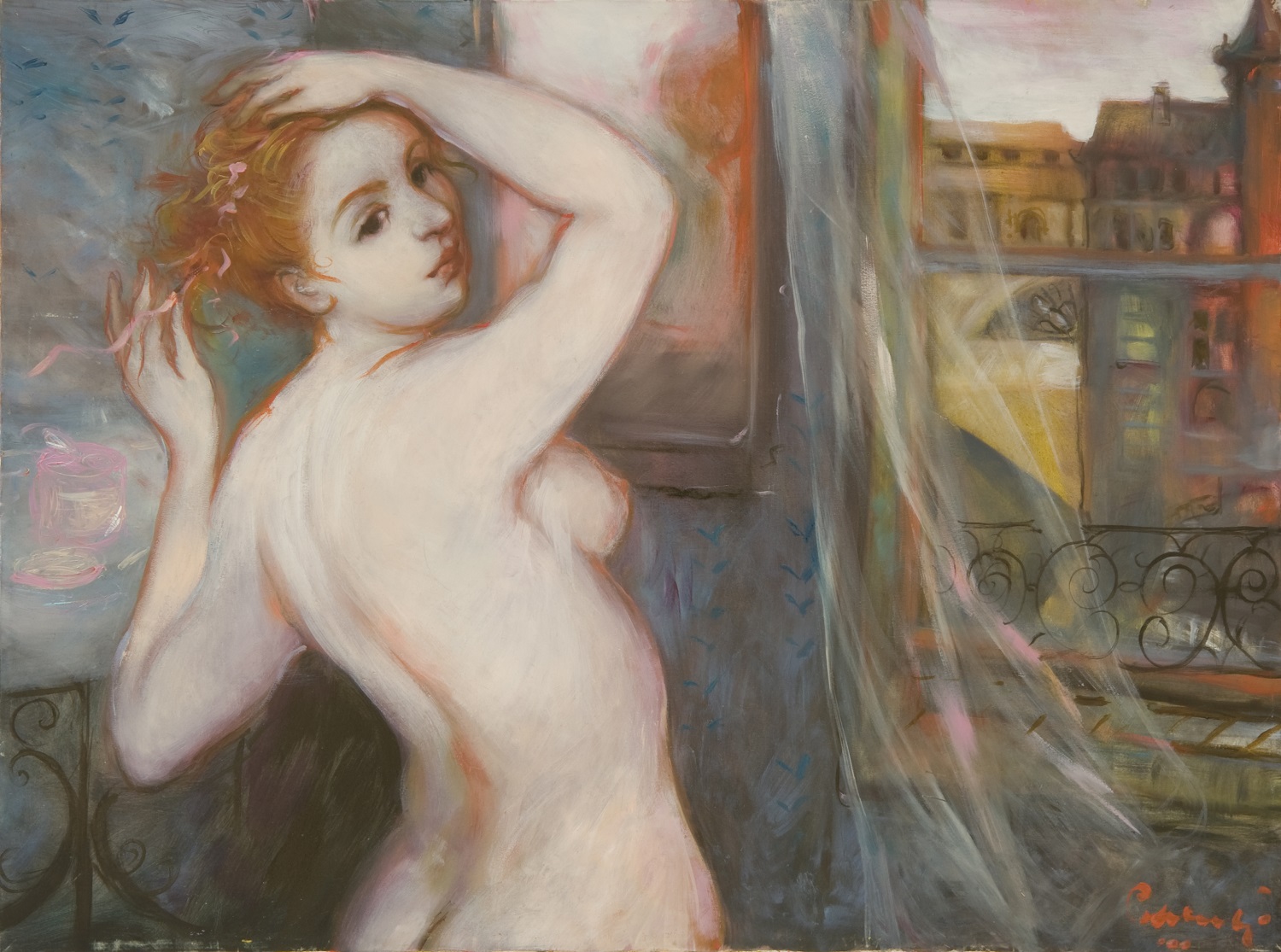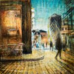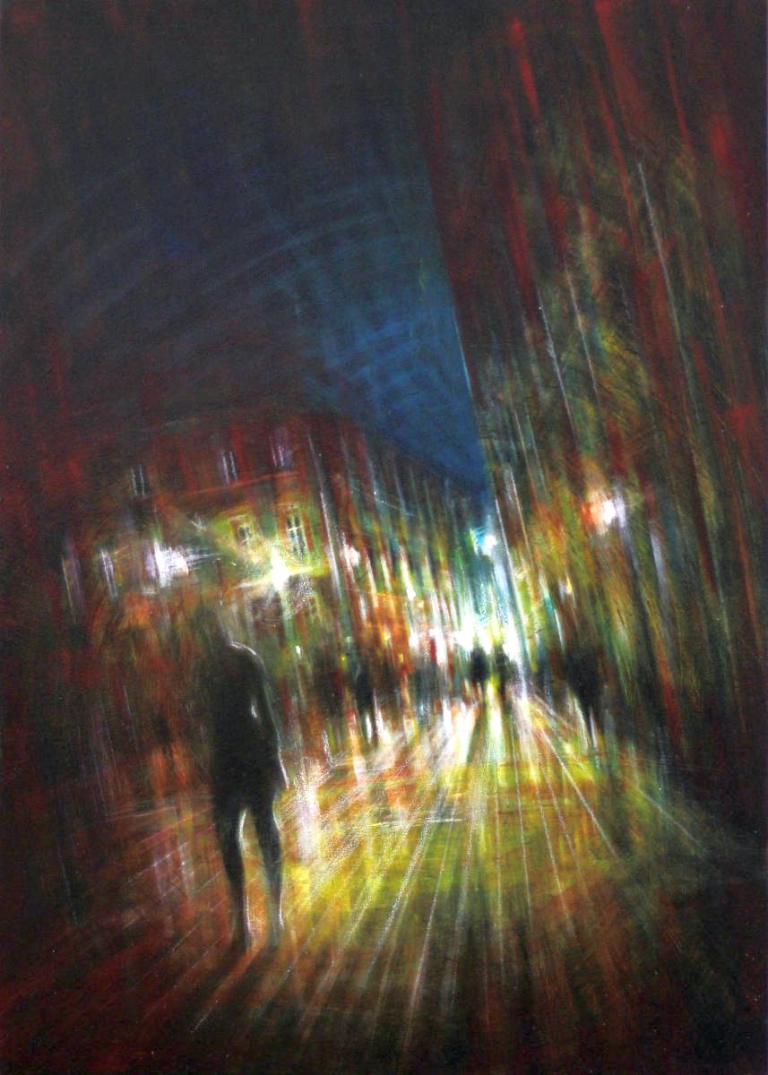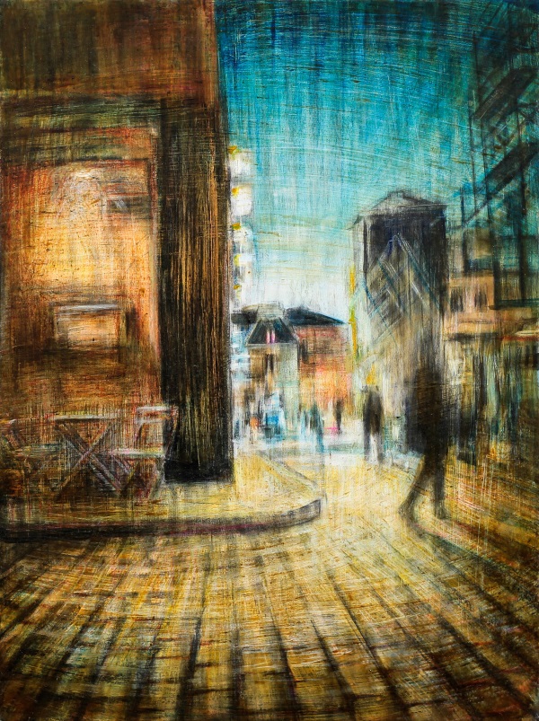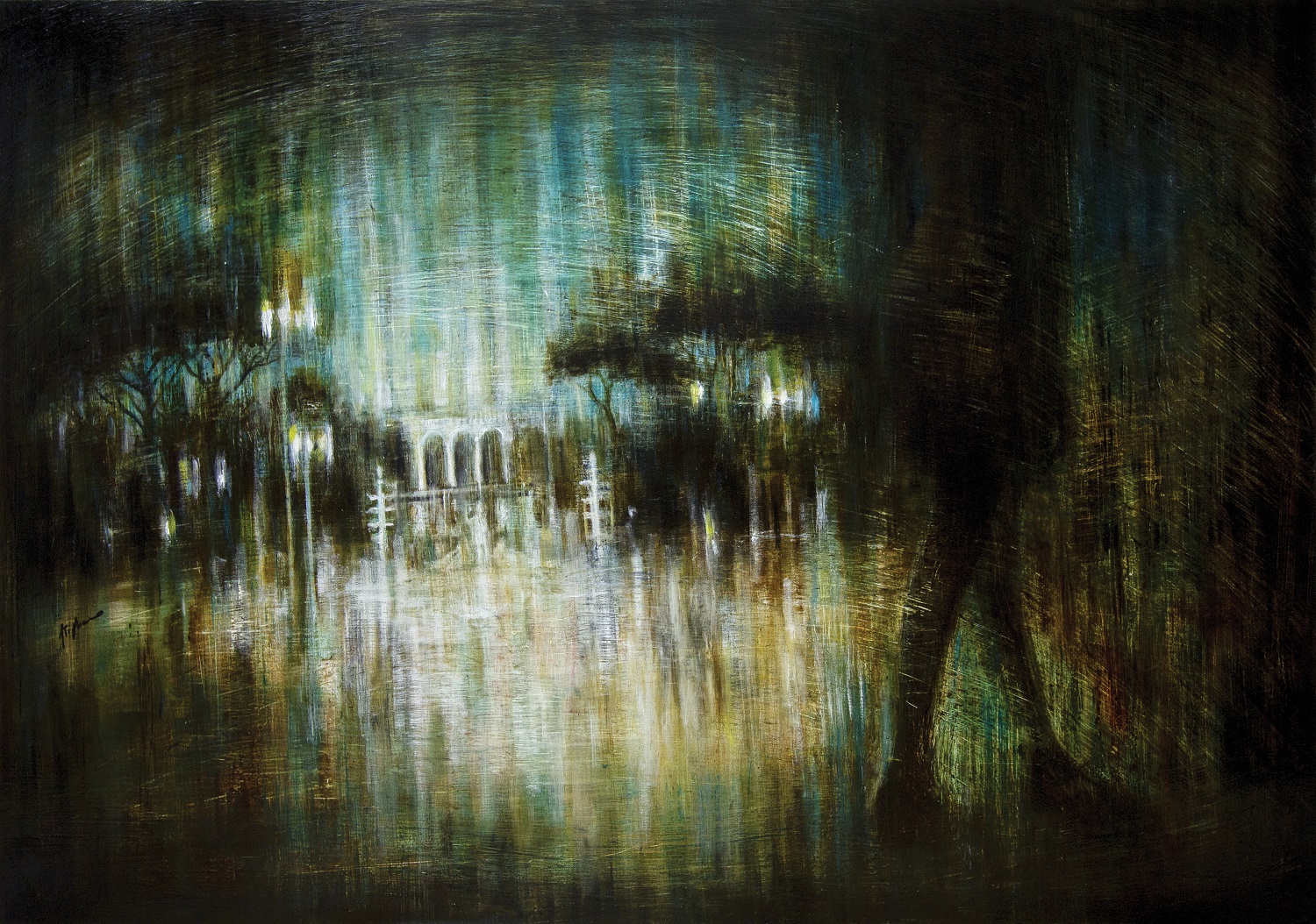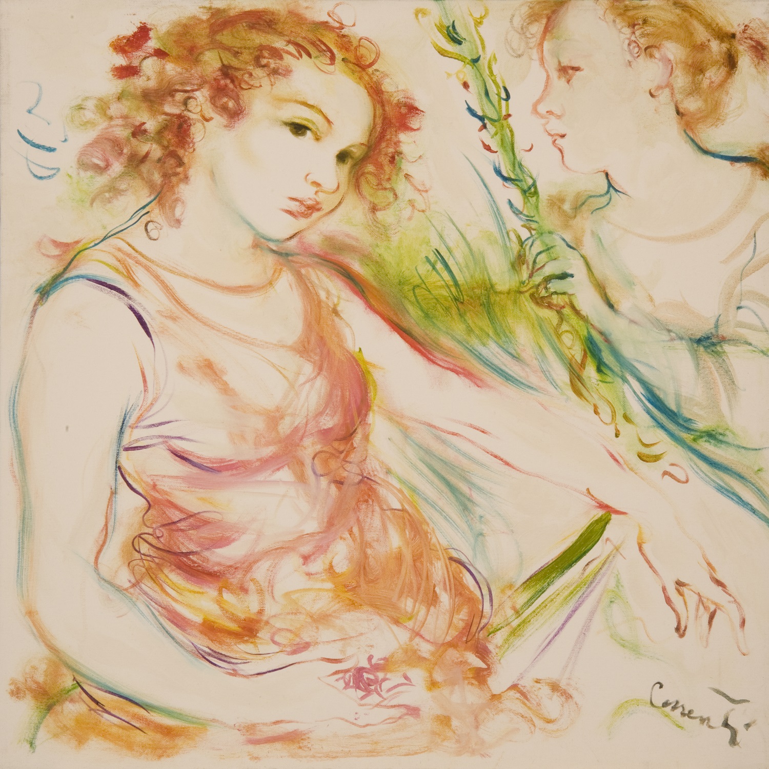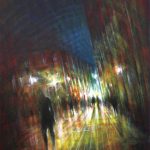 Il tempo, come descrizione dell’attimo sospeso, è l’elemento che lega i linguaggi di queste due artiste differenti per generazione e formazione. Roberta Correnti (Roma, 1945) pone al centro del proprio lavoro la rappresentazione di scene per lo più prive di elementi contemporanei; le sue fanciulle, serene e leggere, abitano luoghi distanti dai rumori e dalla frenesia urbana. Tutto, dalle vesti alle acconciature, dalle atmosfere ai passatempi, ci trasporta in un’epoca lontana, bucolica e silenziosa. Mariarosaria Stigliano (Taranto, 1973), al contrario, fa della città la dimensione prediletta ma nei suoi scorci mira al recupero del ricordo, del sogno e dell’emozione. Per questo le rare figure sono ombre non identificabili ed i piani prospettici sono inclinati e pronti a scivolare via dalla nostra mente.