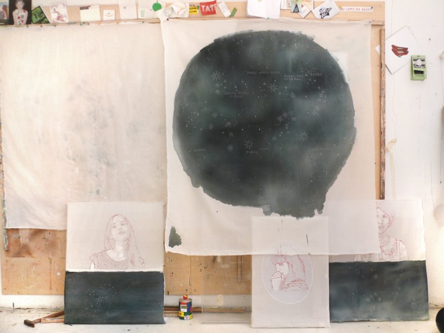 Un'inedita carta da parati disegnata dall'artista e prodotta dall'azienda Inkiostro Bianco, è il fondale sul quale la sua morbida linea rossa scorre, disegnando figure nella sequenza yoga del Saluto al sole. Questa pratica che l'artista segue da tempo consente di aprire i propri centri all'energia solare e a quella del cosmo in generale, e le ha fornito concentrazione e ispirazione pe questo percorso metafisico tra terra e universo, realtà e immaginazione, pratica artistica e teoria scientifica.