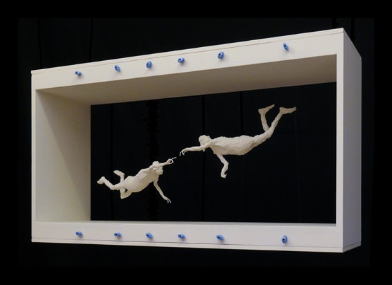Nell’installazione vengono eliminati tutti gli oggetti, le cose, la cui esistenza è suggerita unicamente dalla mimica dei personaggi, unici soggetti dell’opera. Ci sono solo loro sospesi nel vuoto, tenuti in stato fluttuante da invisibili fili di nylon.