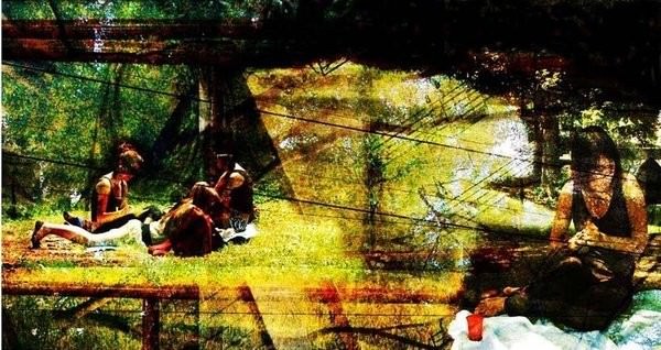 Scorre la pianura sulla retina dell'artista. Terre d'acqua tra Piemonte e Lombardia, mentre la mente e' già all'articolo del free press, abbandonato sul sedile a fianco. Scorrono le strip di un vecchio fumetto e con eguale velocità la folla dei passanti solitari, al di là del vetro. Scorrono la tastiera consunta di un vecchio telefono a gettoni e la fermata del metro'. Scorrono le nuvole e le forme dure degli edifici. Scorre il ricordo di una luminosa colazione sull'erba.