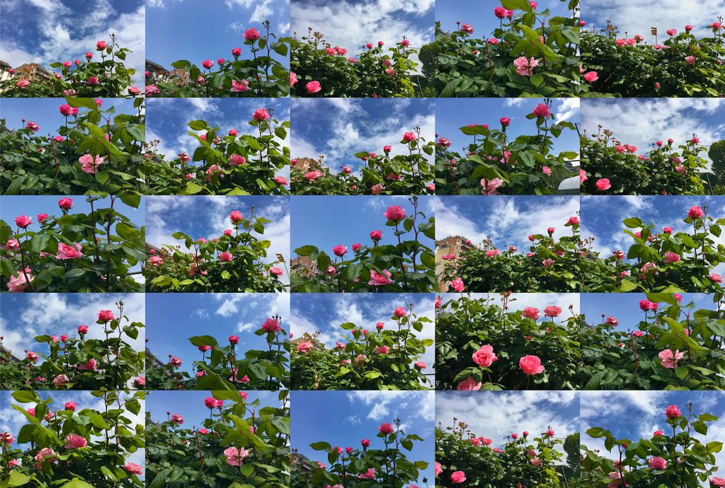 L’obiettivo di Roberto Fanari, abbandonata l’oscurità notturna dei suoi paesaggi, coglie, oggi, scatto dopo scatto, con ritmo incalzante e quasi orgiastico, fiori, foglie, spine, steli, boccioli e cespugli di rose, fresche o inaridite, rigogliose o appassite, in un tripudio festoso di colori complementari contro cieli bianchi e azzurri: le immagini divengono nastri di grande forza narrativa che, con ritmo cadenzato, si srotolano all’infinito, come decorative sequenze di fotogrammi o frammenti di pseudo scientifiche classificazioni.