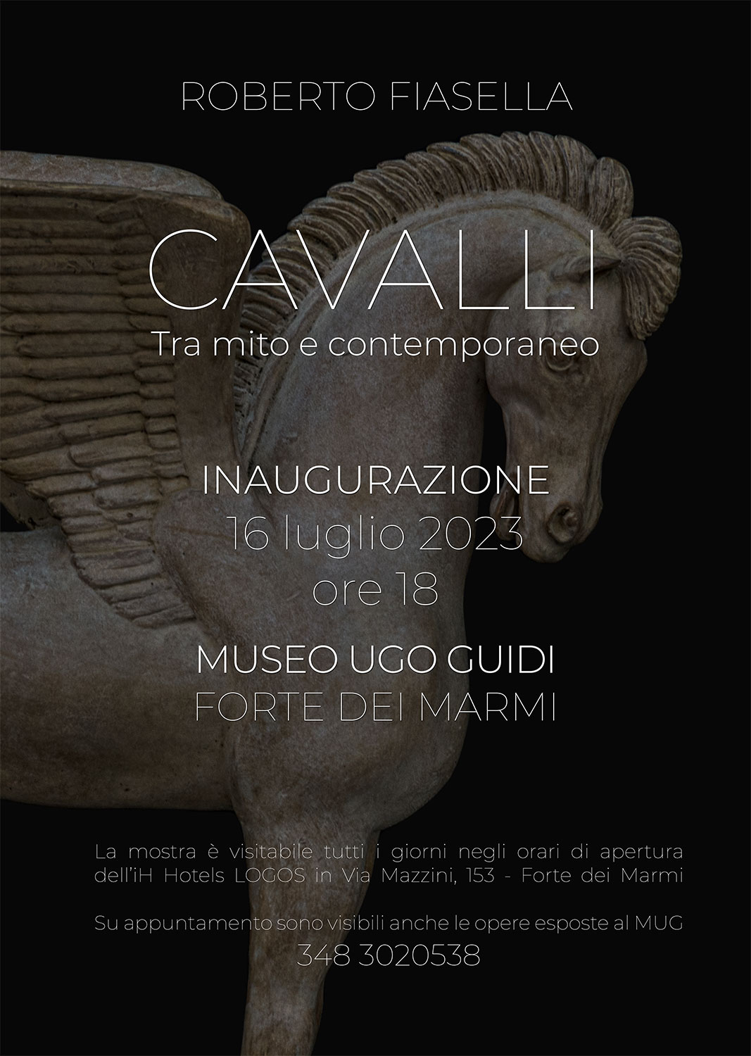 Il museo Ugo Guidi di Forte dei Marmi dal 16 al 28 luglio 2023 ospita la mostra personale dell’artista Roberto Fiasella con inaugurazione alle ore 18.00; nell’occasione verrà presentato il suo libro monografico “Roberto Fiasella – Cavalli – tra Mito e Contemporaneo”, con testi di Jiménez Deredia