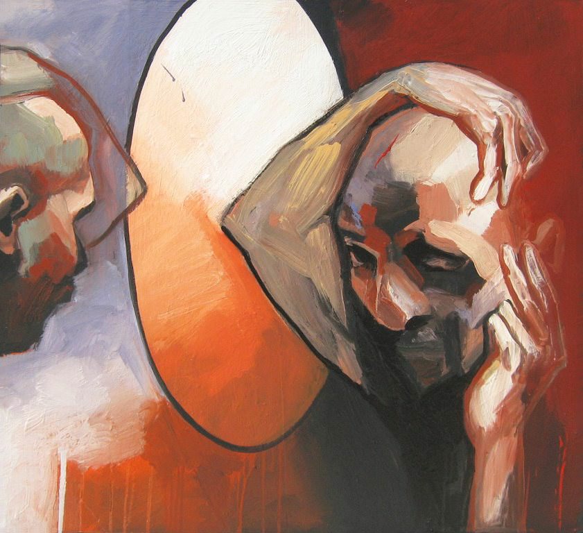Viviamo una quotidianità selfie-sminuente, di asocialità social e di estemporanei momenti di celebrità vacua, di non sense immaginifici e di nonlieux innocui. Viviamo il trionfo dell’apparire ad ogni costo che ci rende manichini di cera per il puro godimento altrui, che ci squaglia alla prima giornata di sole. E Roberto Fontana somatizza lo spaesamento e la spersonalizzazione dello spirito contemporaneo da proiettarli vigorosamente sulle sue tele di grande formato, dalle quali affiorano volti emaciati, smorfie addolorate e corpi in agonia. E come per i virtuosismi ottici con gli specchi convessi di Escher, nell’artista palermitano a prevalere sono la deformazione dei corpi e dei volti, spesso piegati in contorsioni urlate, l’apertura oltre la tela che pervade il visitatore e lo stravolge con sensazioni forti, il ribaltamento della destra con la sinistra, che è anche un’estraniazione dalla propria immagine che coesiste con un paradossale autoriconoscimento.