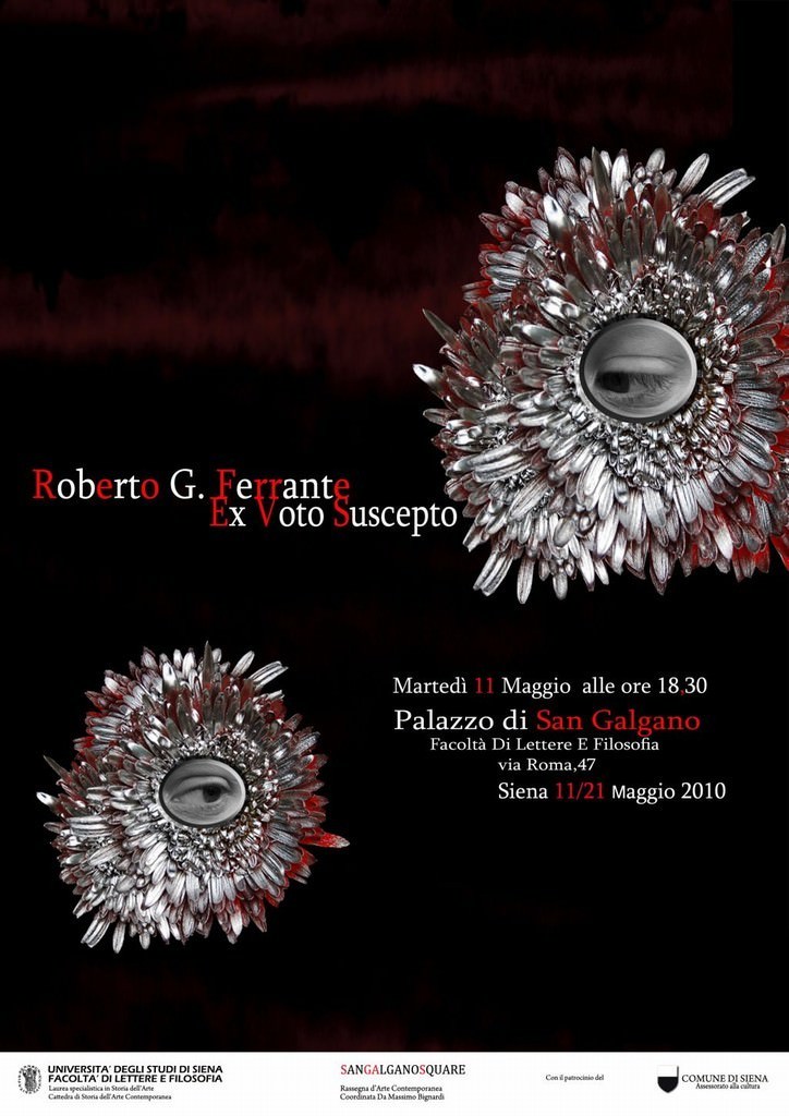Il luogo, suggestivo e carico di significati, accoglierà, a partire dall'11 maggio, l'installazione Ex Voto Suscepto realizzata da Roberto G. Ferrante, in un continuo ed incessante dialogo tra la vocazione tradizionalmente storica e religiosa che permea le mura del palazzo quattrocentesco, di cui i mattoni a bugnato sono silenti testimoni, e la tensione costante alla sperimentazione tipica del linguaggio contemporaneo. In San Galgano, Ferrante reinterpreta le sollecitazioni impresse e radicate nella memoria di ciascuno di noi sin dall'infanzia e profondamente legate al culto popolare ed alla tradizione religiosa cristiana, che individua nell'ex voto la tangibile e manifesta intenzione del fedele di mantenere sempre viva la solenne promessa fatta al cospetto di Dio, in cambio dell'ottenimento di una particolare grazia. Inoltre il voto, nel senso più ampio del termine, assume anche una fondamentale connotazione etica, in quanto richiede strenua volontà e perseveranza da parte di colui che lo ha onorato nell'impegnarsi al mantenimento della promessa. Attraverso la sua installazione l'artista contribuisce all'arricchimento ed alla ri-definizione dello spazio architettonico, già fortemente connotato e che ora si riappropria del suo originario ruolo di luogo dedicato al ricordo di San Galgano, la cui vita è avvolta nel mistero, ma che si narra abbia ricevuto la chiamata di Dio durante l'attraversamento di un prato fiorito, dal profumo intenso e soave. Ed è proprio il fiore il centro nevralgico ed il fulcro dell'opera di Ferrante, attento e sensibile nei confronti della natura, come testimoniano la sua biografia artistica, la sua formazione e le sue installazioni dedicate al tema. L'attaccamento, la cura e l'amore per la terra, il cultus, nel caso specifico dell'installazione senese, sono direttamente collegabili al culto religioso, come suggerisce anche la comune derivazione latina del termine: la natura entra in rapporto osmotico con la spiritualità e ne diventa l'eroico baluardo.