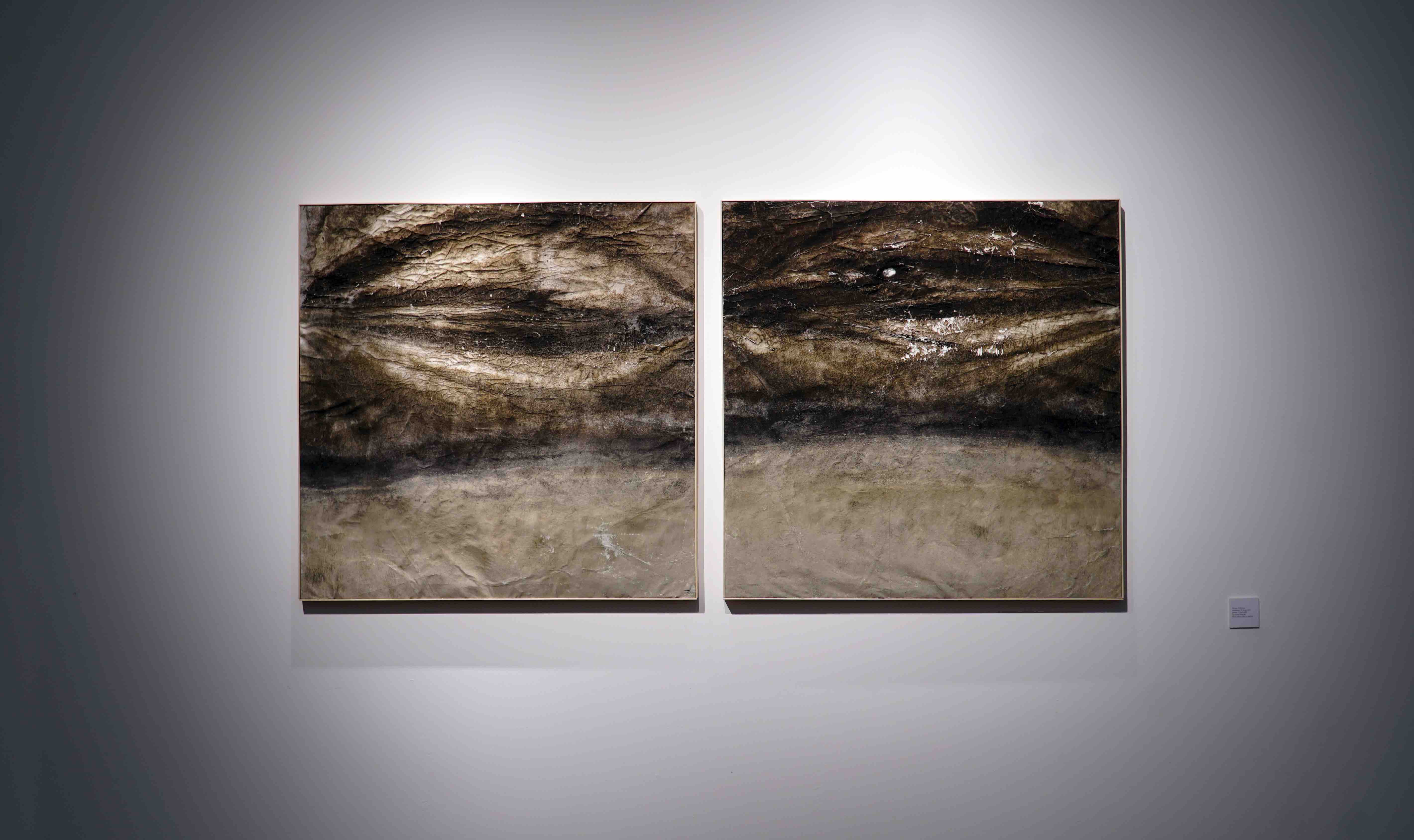 Ghezzi ha così messo in atto il suo processo creativo proprio nel bosco della biodiversità di Phoresta Onlus in Bologna e da lì sono emerse tele che restituiscono appieno l’ambiente in cui sono rimaste per mesi. La terra nera che imprime la tela bianca del supporto o dalla quale emerge con segni netti trasmette appieno la selvaticità di quell’area, le sue asperità. Questi sorprendenti risultati ottenuti a Bologna e visibili in mostra, supportati anche dalle tavole progettuali, sono qui affiancati da altre Naturografie, realizzate immergendo le tele di cotone nelle terre del Parco Nazionale delle Foreste Casentinesi e quelle di crinolina nelle acque del lago Trasimeno e nel fiume Piave (queste ultime nell’ambito di Una tela sospesa tra Arte e Scienza, a cura di Elena Cantori e Monica Mazzolini per il Comune di San Donà di Piave).
