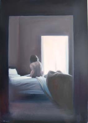 Una formulazione più sintetica ed essenziale connota l'ultimo repertorio di Roberto Ghezzi, incentrato esclusivamente su scenari marini e ritratti di ambienti con figure femminili. Ciò che affiora da questi lavori, non è semplicemente una veduta vasta ed aperta di natura o uno spazio interno abitato da una solitaria presenza in atteggiamento meditativo, bensì l'immagine riflessa di sensazioni, stati d'animo e sentimenti appartenenti alla dimensione interiore dell'artista, ad una sua particolare condizione emotiva e psicologica.