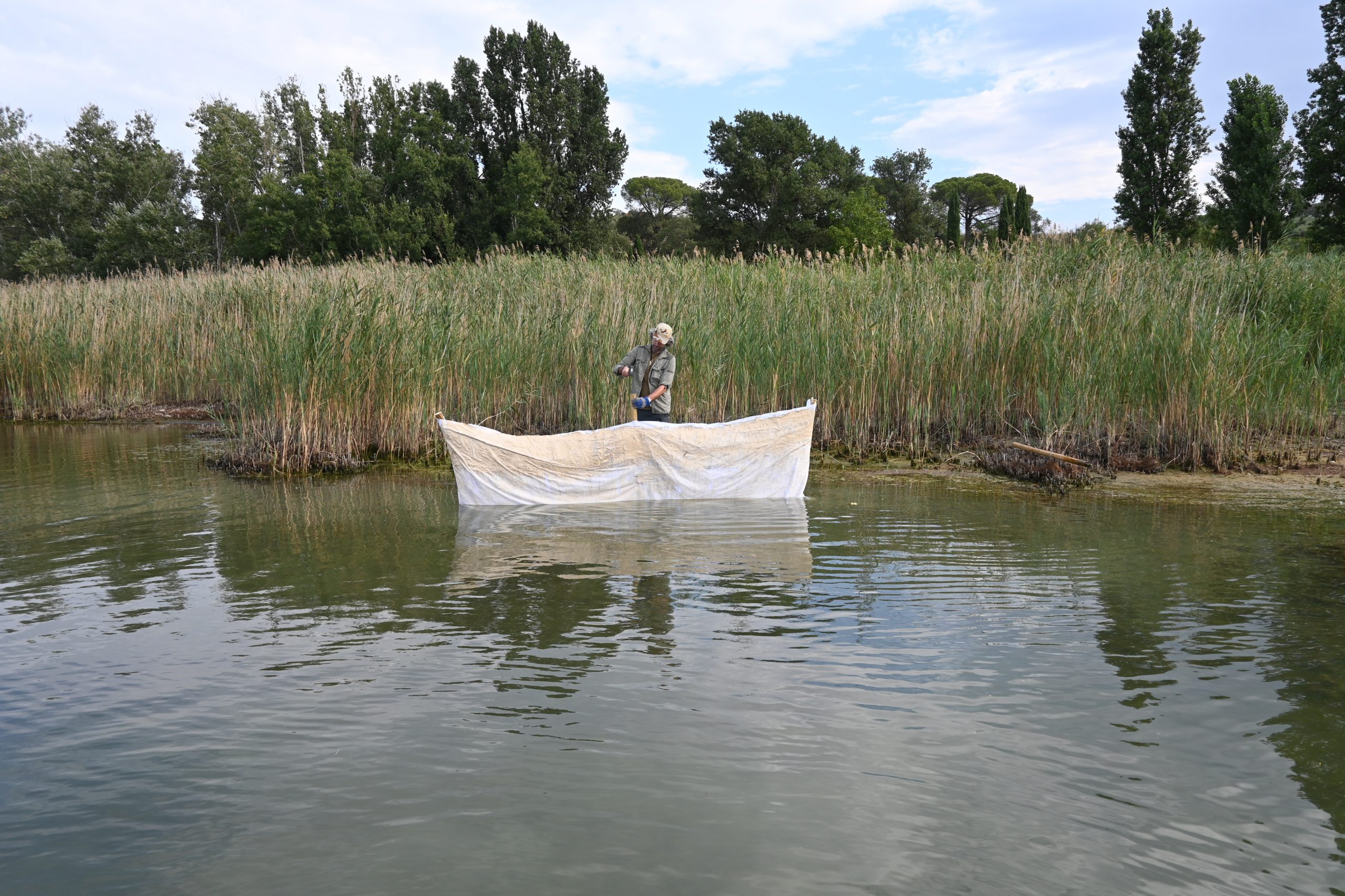 Le fasi del progetto: Il progetto ha visto in prima battuta la realizzazione delle opere. Nei mesi di agosto/ottobre-dicembre, intrecciando istanze di ricerca di Arpa e di tipo artistico e pratico, secondo la propria metodologia di lavoro, Roberto Ghezzi ha installato tessuti pretrattati in 4 diversi habitat dell’isola Polvese e altre tele presso la costa di Castiglione del Lago. Una volta che la natura ha compiuto il suo corso e l’artista ha deciso che il processo di formazione delle tele era compiuto, sono state ritirate e si è avviata una fase di studio ecologico e biologico al microscopio da parte di Arpa e una fase di trasformazione dei tessuti in opere adatte per le 6 mostre che si apriranno nel mese di febbraio/aprile 2023.