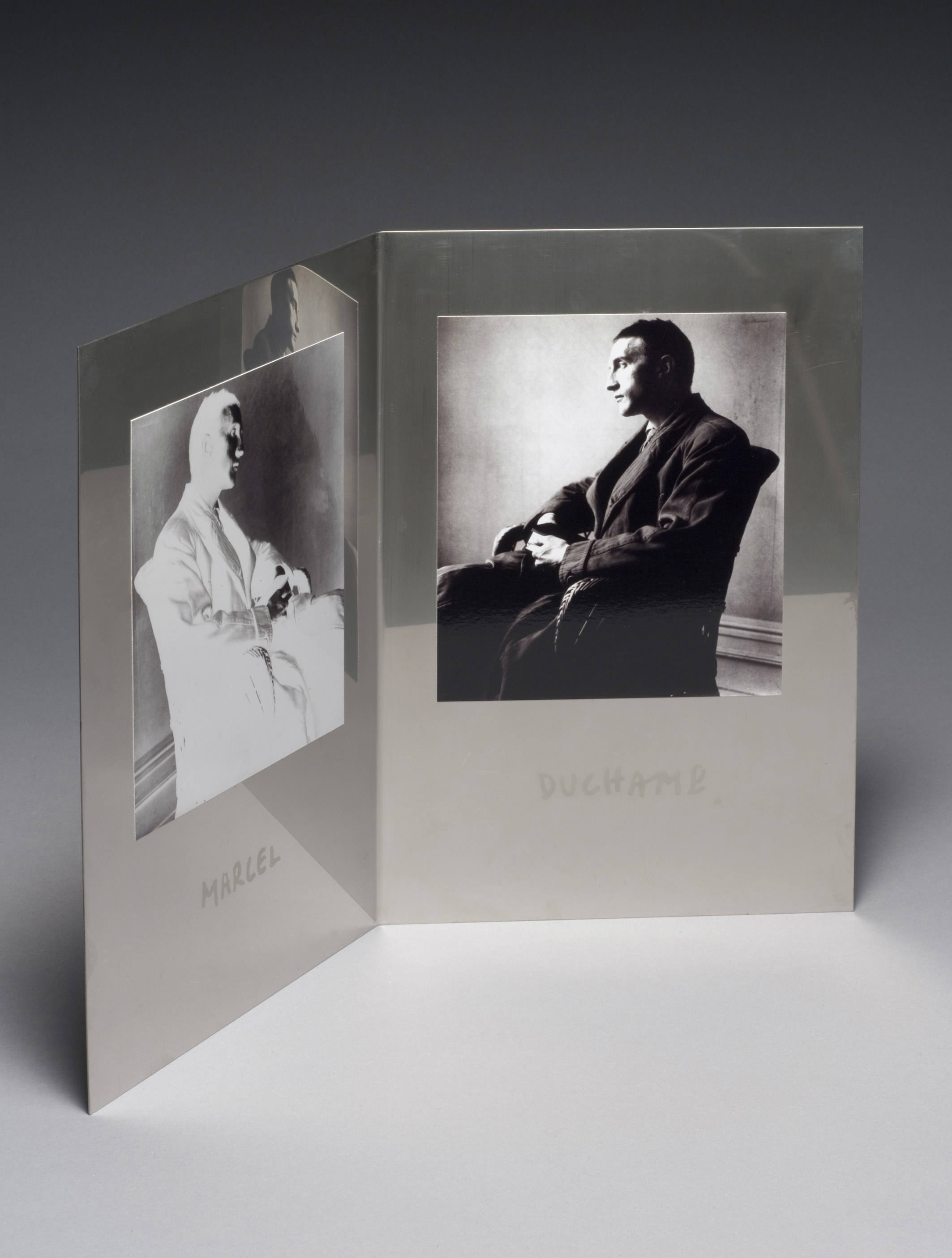 Altro tema coltivato da Roberto Goffi è quello espresso con Duchamp (acciaio inox, stampe fotografiche, cm 33x38x9, 2001), opera della serie Ritratti. Questo lavoro “è un omaggio – meditazione su Duchamp, padre di tutti noi” dice Roberto Goffi. Una lamiera piegata in guisa di libro dove due immagini del grande maestro, una in positivo una in negativo, si compenetrano e dialogano, in un continuo scambio tra mondo interiore ed esteriore.