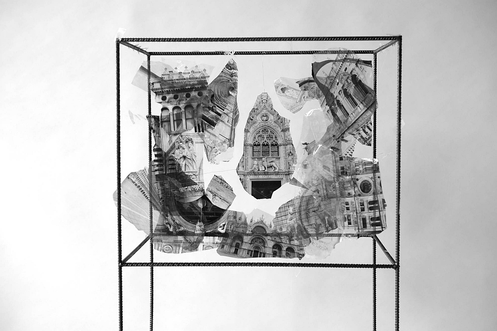 All’interno di una struttura in tondino di ferro per cemento armato, che pur cosparsa di ruggine esibisce una forza e una permanenza nel tempo, vi sono esili ed eteree gelatine, impressionate con frammenti di edifici, di statue, di luoghi che fanno parte del patrimonio storico italiano, evocative di un mondo prezioso.