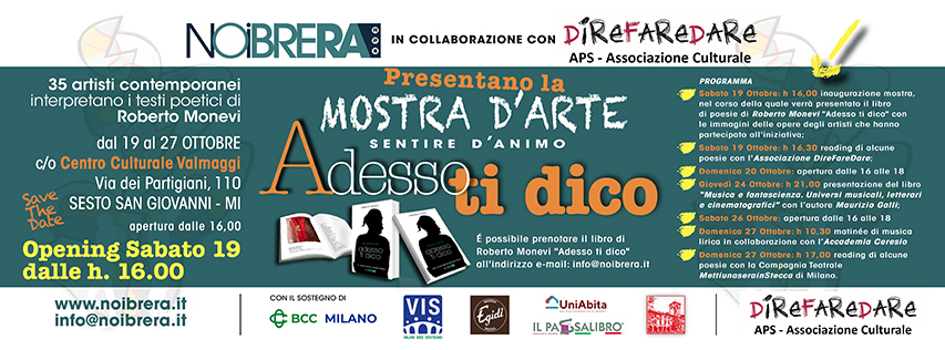 Dopo Milano, Vigevano e Oggiono, ultima edizione della mostra dedicata alle parole poetiche di Roberto Monevi e alle forme e colori degli artisti dell’Ass.NOIBRERA che hanno tramutato visivamente le sue parole. Reading di testi interpretati da TeatroLab-Ass.DIREFAREDARE e da MettiunaserainStecca.