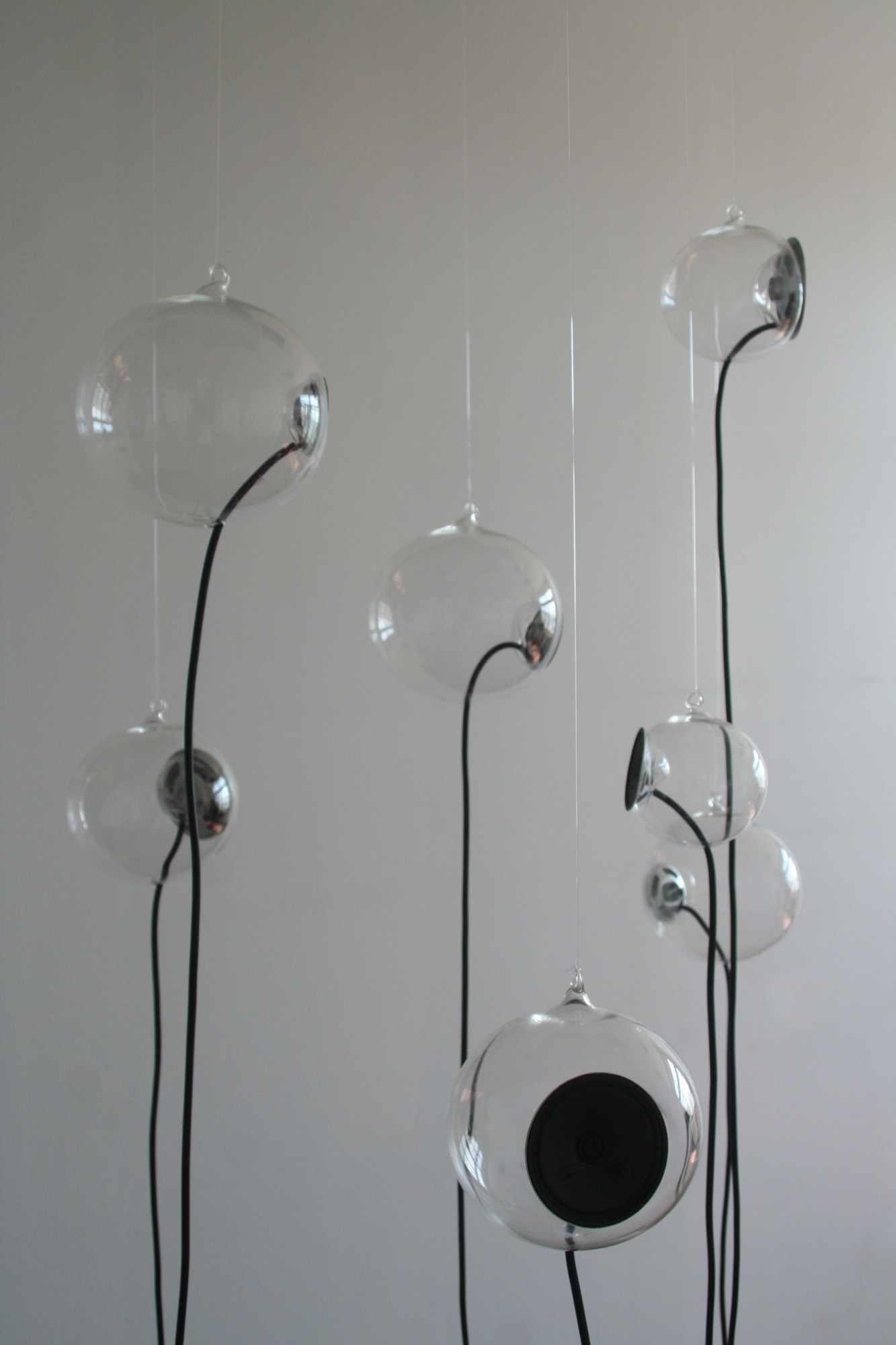 L’installazione, realizzata appositamente per lo spazio genovese, intende mettere in relazione tramite il riciclo di energia acustica, lo spazio chiuso della galleria con il mondo esterno. Al centro del salone espositivo sono sospese ad altezze differenti 60 sfere di vetro trasparente di diverse dimensioni. Dentro ciascuna sfera sono incastonati dei coni audio direttamente collegati a un sistema di elaborazione che processa in tempo reale il suono captato da alcuni microfoni posizionati all’esterno, nella strada prospiciente la galleria.