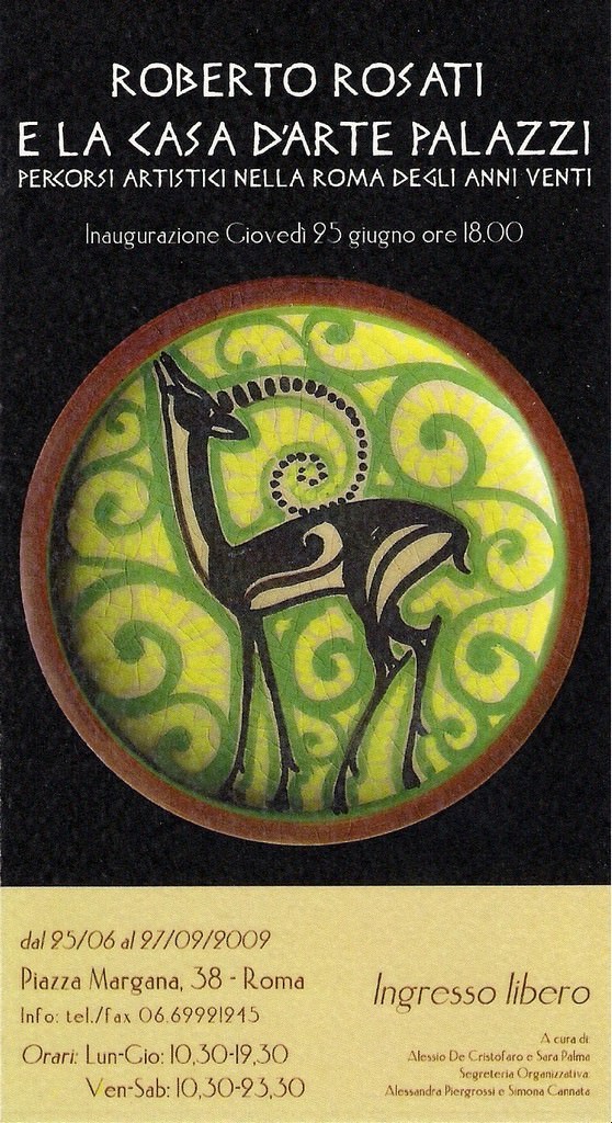 Il tuo browser potrebbe non supportare la visualizzazione di questa immagine.Tra il Liberty e il primo Déco, si sviluppano a Roma e nel Lazio diverse produzione ceramiche grazie all’intervento di artisti come Cambellotti, Prini, Randone, Rosati, Palazzi. e molti altri ancora. La mostra che inaugura il 25 giugno 2009 e avrà una durata di tre mesi fino al 27 settembre 2009, presenta oltre 30 opere, tra ceramiche, serigrafie e tele ad olio, approfondendo le figure di Roberto Rosati e Ferruccio Palazzi.