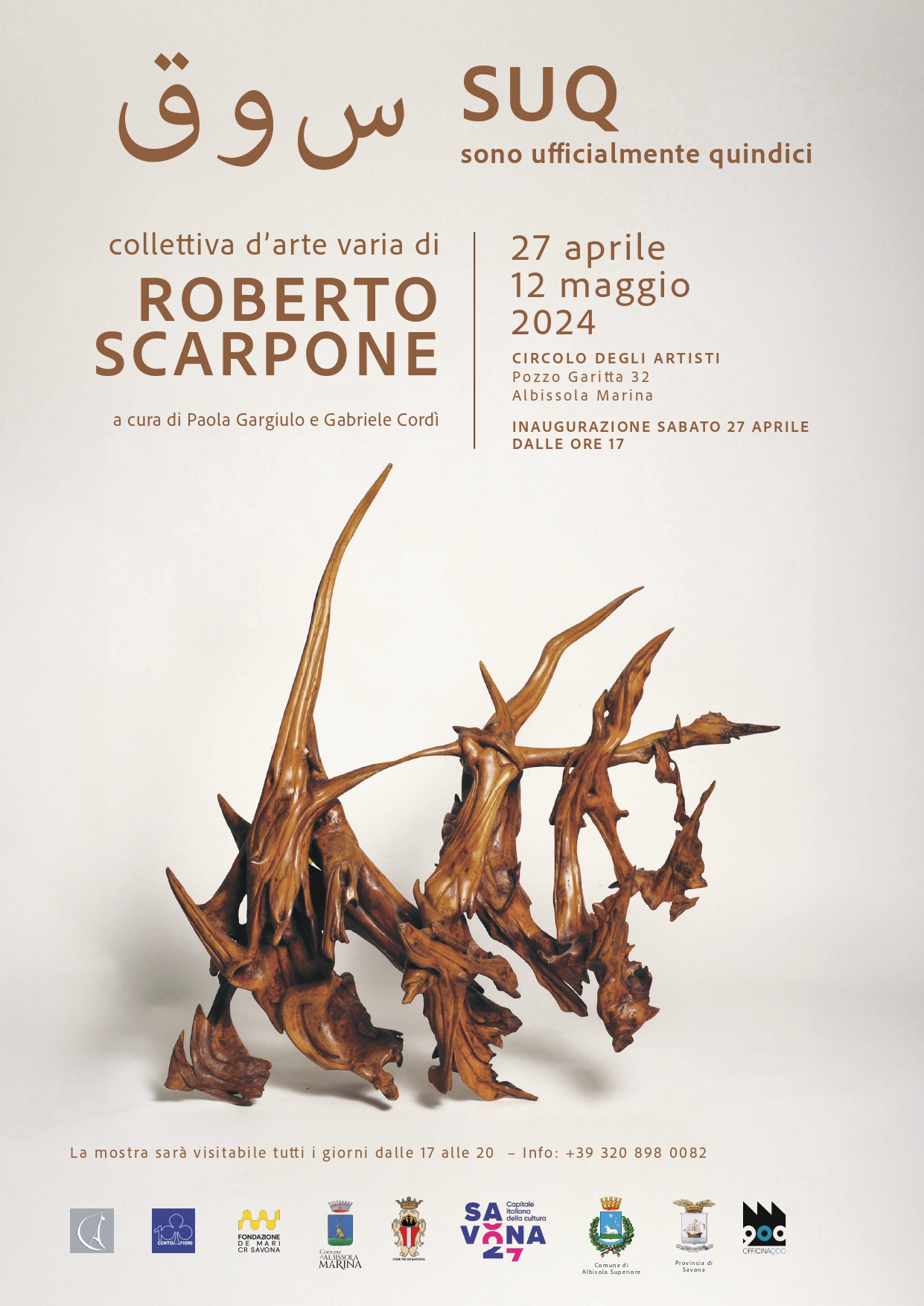 Roberto Scarpone celebra i quindici anni di attività con una mostra presso il Circolo degli Artisti di Albissola Marina. Ispirato dalla vivacità e dalla casualità dei suq, i mercati arabi dove le merci vengono esposte con una varietà di soluzioni, tra colori, suoni e profumi che incantano i sensi dei visitatori. Dal 27 aprile fino al 12 maggio 2024, sarà possibile immergersi nel mondo di Roberto Scarpone, attraverso un corpus di opere eterogenee che rappresentano i vari momenti della sua ricerca, i cui temi principali sono la forma del legno e l’attivismo ecologico.
