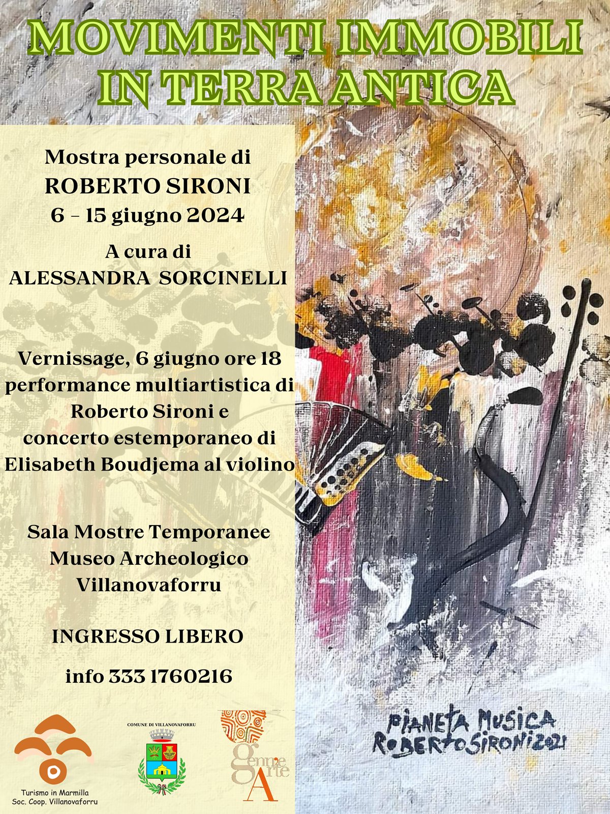 Giovedì 6 giugno, alle ore 18 nella Sala Mostre del Museo Archeologico di Villanovaforru, verrà inaugurata la mostra d’arte “MOVIMENTI IMMOBILI IN TERRA ANTICA”, personale di Roberto Sironi, a cura di Alessandra Sorcinelli