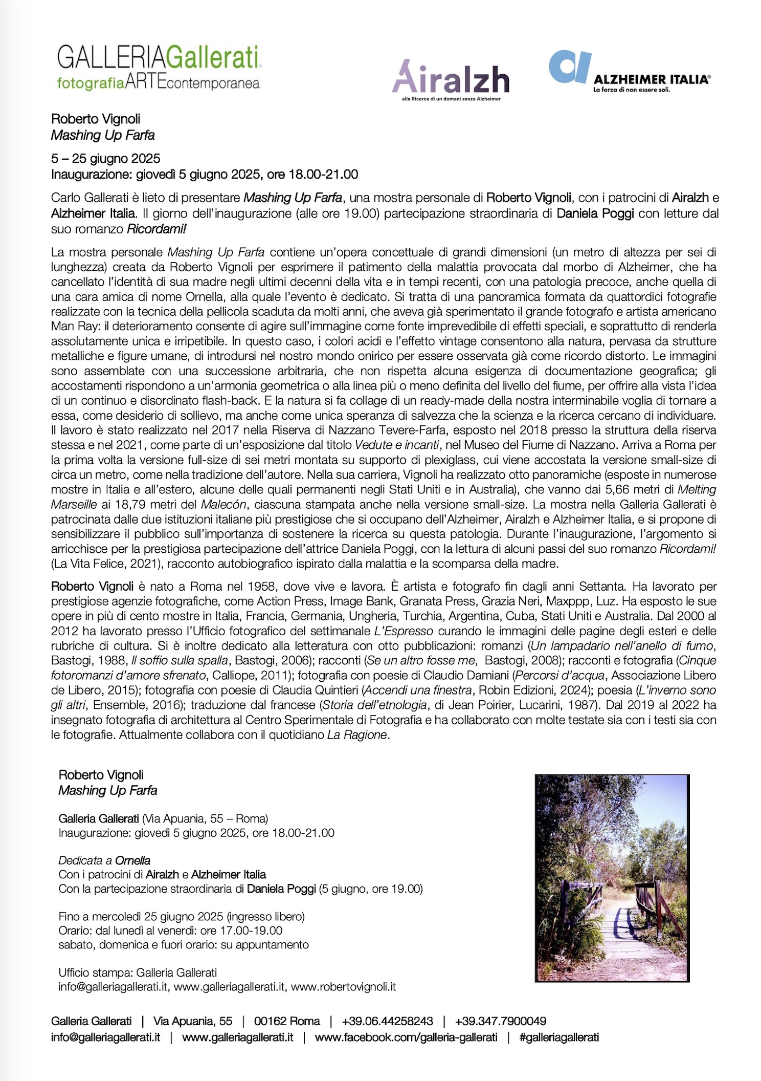 La mostra personale Mashing Up Farfa contiene un’opera concettuale di grandi dimensioni (un metro di altezza per sei di lunghezza) creata da Roberto Vignoli per esprimere il patimento della malattia provocata dal morbo di Alzheimer, che ha cancellato l’identità di sua madre negli ultimi decenni della vita e in tempi recenti, con una patologia precoce, anche quella di una cara amica di nome Ornella, alla quale l’evento è dedicato. Si tratta di una panoramica formata da quattordici fotografie realizzate con la tecnica della pellicola scaduta da molti anni, che aveva già sperimentato il grande fotografo e artista americano Man Ray: il deterioramento consente di agire sull’immagine come fonte imprevedibile di effetti speciali, e soprattutto di renderla assolutamente unica e irripetibile. In questo caso, i colori acidi e l’effetto vintage consentono alla natura, pervasa da strutture metalliche e figure umane, di introdursi nel nostro mondo onirico per essere osservata già come ricordo distorto. Le immagini sono assemblate con una successione arbitraria, che non rispetta alcuna esigenza di documentazione geografica; gli accostamenti rispondono a un’armonia geometrica o alla linea più o meno definita del livello del fiume, per offrire alla vista l’idea di un continuo e disordinato flash-back. E la natura si fa collage di un ready-made della nostra interminabile voglia di tornare a essa, come desiderio di sollievo, ma anche come unica speranza di salvezza che la scienza e la ricerca cercano di individuare. Il lavoro è stato realizzato nel 2017 nella Riserva di Nazzano Tevere-Farfa, esposto nel 2018 presso la struttura della riserva stessa e nel 2021, come parte di un’esposizione dal titolo Vedute e incanti, nel Museo del Fiume di Nazzano. Arriva a Roma per la prima volta la versione full-size di sei metri montata su supporto di plexiglass, cui viene accostata la versione small-size di circa un metro, come nella tradizione dell’autore. Nella sua carriera, Vignoli ha realizzato otto panoramiche (esposte in numerose mostre in Italia e all’estero, alcune delle quali permanenti negli Stati Uniti e in Australia), che vanno dai 5,66 metri di Melting Marseille ai 18,79 metri del Malecón, ciascuna stampata anche nella versione small-size. La mostra nella Galleria Gallerati è patrocinata dalle due istituzioni italiane più prestigiose che si occupano dell’Alzheimer, Airalzh e Alzheimer Italia, e si propone di sensibilizzare il pubblico sull’importanza di sostenere la ricerca su questa patologia. Durante l’inaugurazione, l’argomento si arricchisce per la prestigiosa partecipazione dell’attrice Daniela Poggi, con la lettura di alcuni passi del suo romanzo Ricordami! (La Vita Felice, 2021), racconto autobiografico ispirato dalla malattia e la scomparsa della madre.
