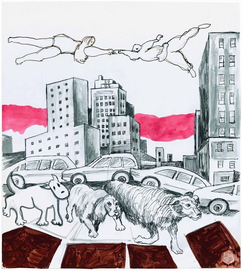 La moto insieme all’automobile è un oggetto-feticcio della società dei consumi, ed ecco in “Il drago Drake” l’accostamento tra il drago-unicorno (tanto simile al cavallino rampante di una nota casa automobilistica) e una rossa berlina, in questo caso un’immagine pubblicitaria ritagliata da una rivista. La cultura di massa ritorna anche in un’altra illustrazione “La quercia”, dove ancora una volta c’è l’inserimento a collage di una bicicletta, ma soprattutto c’è un altro elemento della cultura visiva globalizzata entrato a far parte dell’immaginario iconografico contemporaneo, un personaggio “radiante” tratto dall’opera dell’artista popular per antonomasia, l’americano Keith Haring. Seguendo lo stesso meccanismo citazionista in “Il leprotto” accanto a canarini, piccioni e volatili vari, trattati con un segno grafico descrittivo, scorgiamo un personaggio dei fumetti Disney, uno dei due scoiattoli della coppia “Cip e Ciop”.
