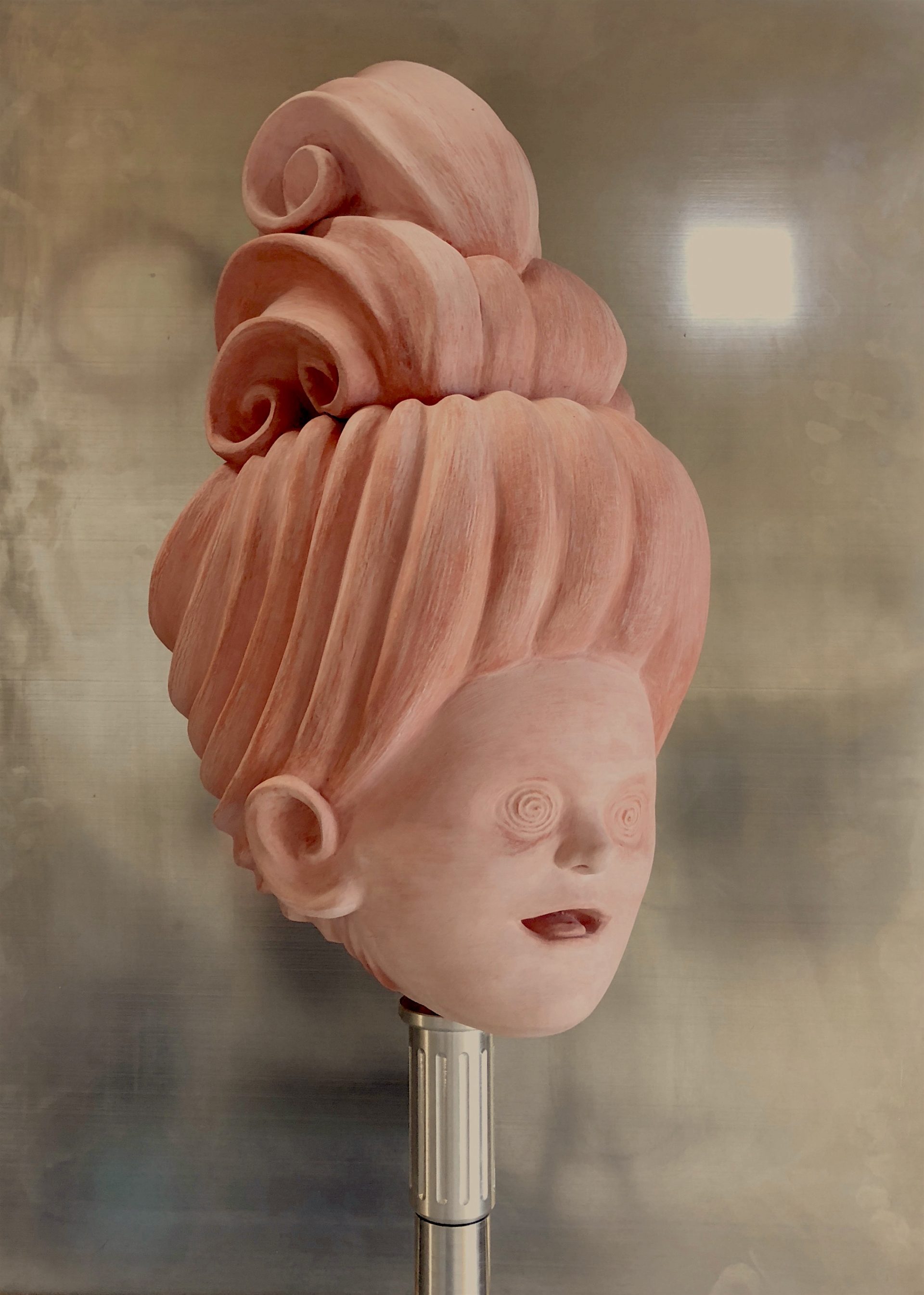 L’artista che per alcuni mesi soggiornerà a Napoli, avrà sicuramente molte risposte a questa domanda. Alcune delle opere, come per esempio il Re Mida o Crono, riflettono pienamente la drammaticità della mitologia antica; altre invece, come per esempio Petulatia, ne esprimono l’ironia e l’astuzia. E’ dall’intenso uso cromatico basato sui colori dell’affresco e all’assoluta libertà formale con cui l’artista le ha modellate, che si entra in contatto con ognuno di questi volti. Potrebbero sembrare sculture di pietra, in realtà l’artista le ha modellate in gesso patinato a calce. Stilisticamente si passa dall’antichità alla modernità senza soluzione di continuità, si gira intorno ad ogni testa per scoprirne la ricchezza dell’acconciatura o della nuca, disegnata con incavature, strisce e linee di grande bellezza. Infatti, la parte posteriore della testa ha la stessa rilevanza del volto: montate su una piattaforma di alluminio spazzolato e grazie ad una maniglia posizionata sull’asta, gira di 360 gradi intorno a se stessa, riflettendo la propria immagine da ogni prospettiva.
