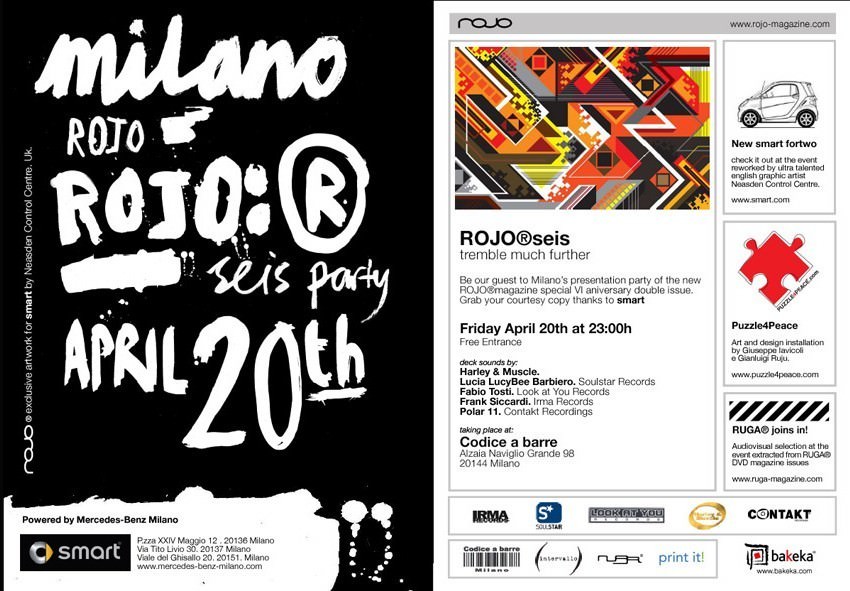 Venerdì 20 Aprile 2007 dalle ore 23.00, ROJO® organizzerà al Codice a Barre (Alzaia Naviglio Grande 98, a due passi da Zona Tortona, cuore degli eventi del Fuori Salone) un launch-party (ingresso libero) in grado di coniugare design, arte, musica e impegno sociale.