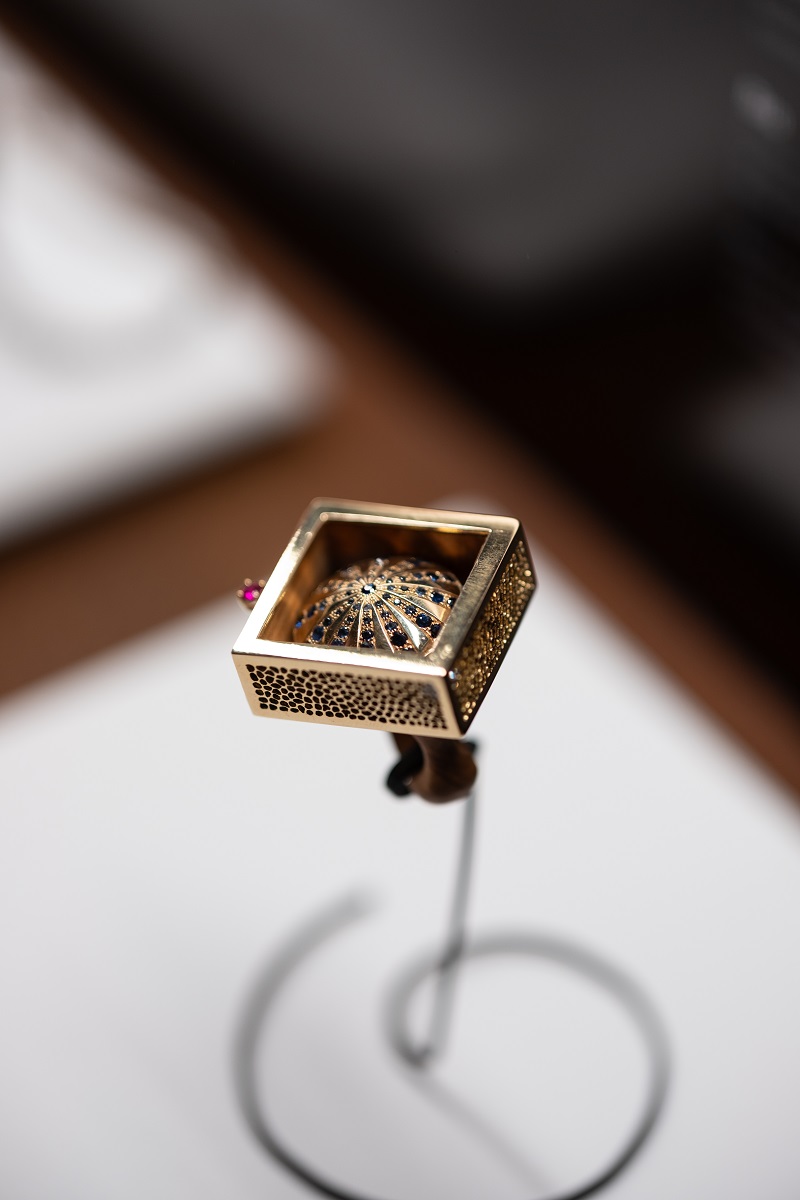 Simone Cipolla nasce in una famiglia di orafi, cresce tra lime ed archetti, bulini e saldatori nel laboratorio di famiglia. Dopo essersi specializzato in Oreficeria Antica a Napoli, frequenta l’Accademia delle Arti Orafe del Maestro Gerardi a Roma. Attualmente ha il suo negozio e laboratorio in Calabria. All’evento tenutosi ai Mercati di Traiano ha presentato il gioiello “Ricordo nel cassetto”; Un corallo di nonna; mi ritrovo con Lei per Roma parlando dei segreti dei vicoli. Le mie figlie e mia mamma parlando dei ricordi di Roma mi riportano al presente. Il corallo, chiuso in un cassetto custodito e protetto, ruotando dà la sensazione di un viaggio nell'iperspazio che unisce passato, presente e futuro. L'artista crea opere uniche che mescolano tradizione, storia familiare e ispirazioni artistiche. Tra le sue creazioni spiccano anelli incisi a mano con cammei e gioielli ispirati a detti locali come “Er giro de Peppe”. Utilizzando materiali preziosi come l'oro e le pietre preziose, dà vita a pezzi che evocano paesaggi e suggestioni artistiche, come un anello che ricrea il tramonto sul mare. Ogni gioiello è un'opera d'arte unica che racconta una storia.