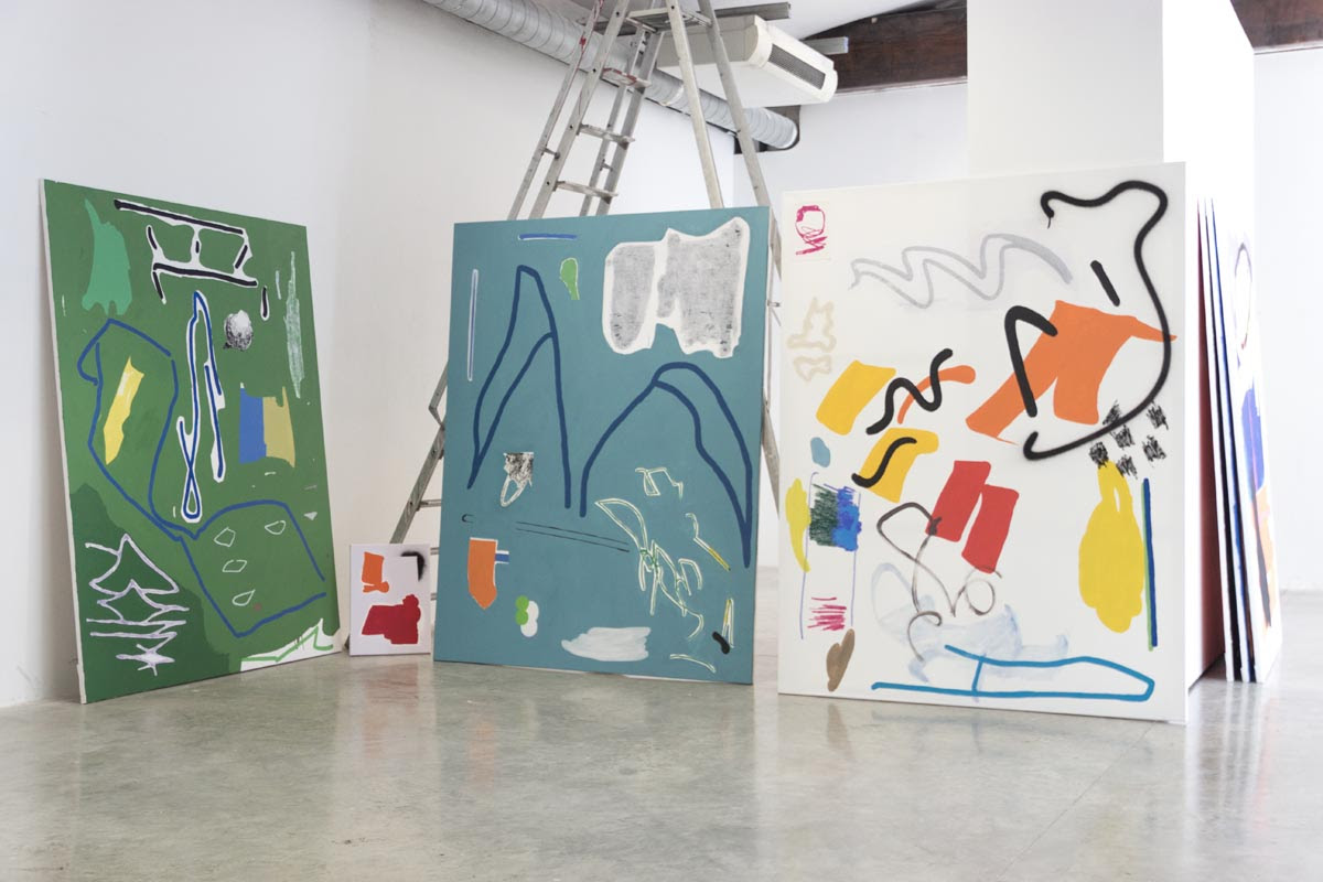 La ricerca artistica di Romain Blanck, di natura pittorica, è basata sull’impiego di forme primarie che vengono combinate a più livelli su di una superficie monocroma, come parole in libertà di un vocabolario visivo primario. Tali segni provengono da un immenso database che l’artista ha costituito negli anni con i foglietti e le pagine di quaderno, strappati nelle cartolerie o nei negozi di belle arti, in cui le persone provano penne, pennarelli, evidenziatori. Ogni segno, ogni disegno o ogni minima unità visiva vengono impiegati dall’artista come delle unità indipendenti di significato, come il lessico con cui articolare un discorso caratterizzato da una grammatica minimale e da una sintassi anarchica. La tela è così il luogo dello scarabocchio, del ghiribizzo, del serpente a zigzag in cui si controlla lo spessore del tratto, del disegnino sciocco in cui si prova un colore o del vortice fatto per far scrivere una penna annoiata il cui inchiostro, in attesa di un utilizzatore che la prenda in mano, è rinsecchito.
