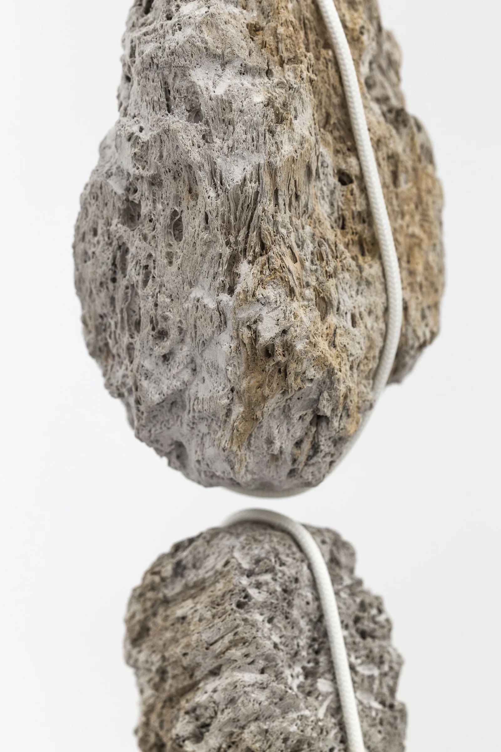 Da Quartz Studio Romain realizza un’installazione site-specific composta da varie pietre vulcaniche che fluttuano nell’aria in modo sconcertante grazie a invisibili forze magnetiche. Le corde nere che collegano le pietre allo spazio tracciano linee precarie che ridefiniscono le possibilità di movimento all’interno dello spazio e rivelano un esercizio coreografico di tensione ed equilibrio.