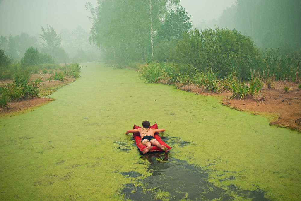 I tappeti decorativi e dai colori sgargianti presenti nelle fotografie di Roman Mokrov sono gli immancabili attributi di una vita felice. Nella cornice di questi tappeti gli uomini amano, si sposano, si riposano, festeggiano le loro ricorrenze. Il tappeto orientale, rimasto nella cultura russa dai tempi delle invasioni mongoliche, mantiene paradossalmente il suo carattere nomadico. Un uomo si mette in viaggio a bordo di un materassino gonfiabile sulle acque di uno stagno interamente ricoperto di alghe. Una candida ed elegante sposa in abito bianco sale per le scale sputacchiate di un condominio. Dei giovani si arrampicano sui tetti e planano sulla città dall'alto di un braccio di una gru. Mokrov racconta i suoi eroi come instancabili vagabondi che percorrono la loro instabile esistenza nella certezza che “lì dove noi non ci siamo, ecco, lì si che si sta bene”.