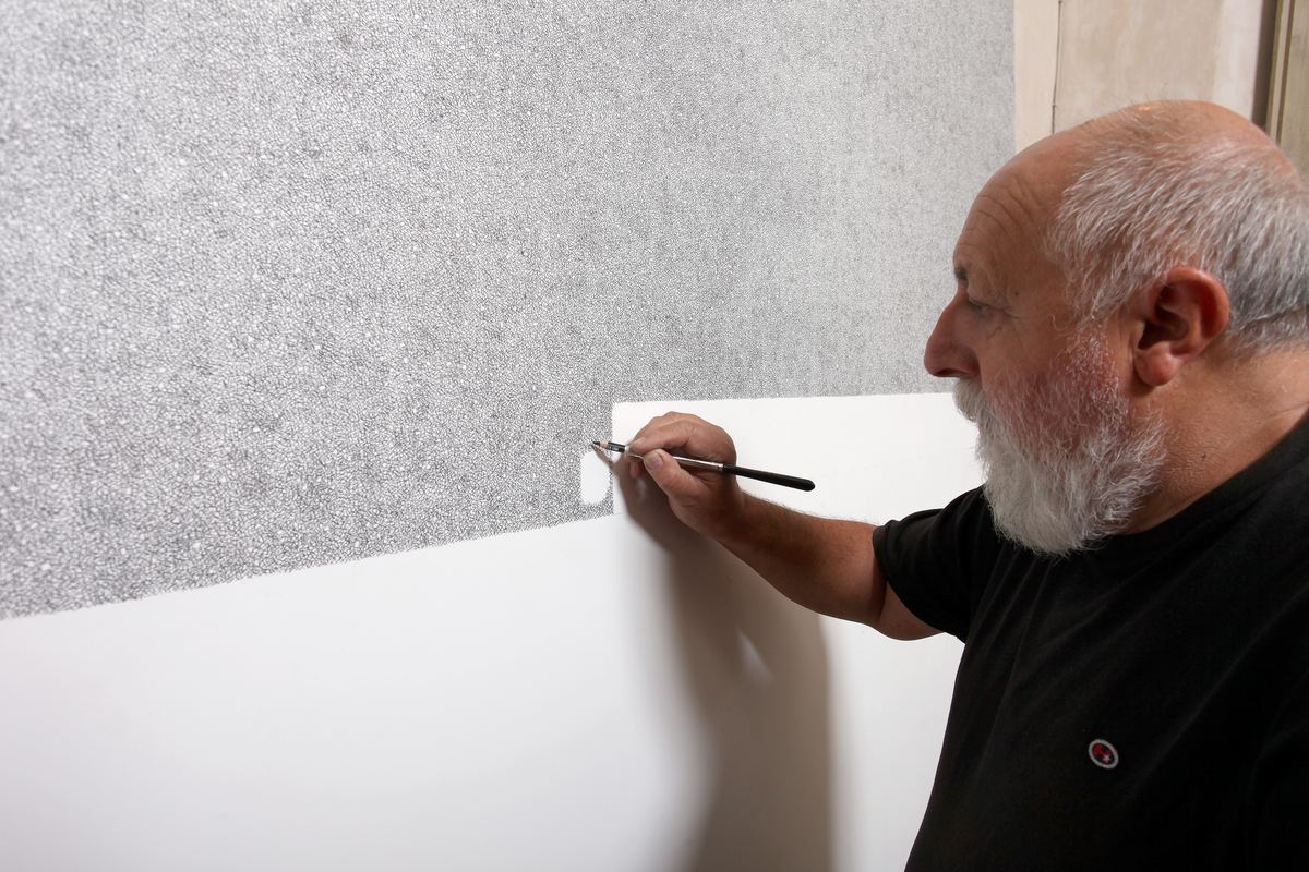 Romano Bertuzzi (Piacenza, 1956) porta a Pavia una serie di opere che testimoniano il percorso più recente della sua ricerca e l’evoluzione della sua straordinaria tecnica di disegno: da un lato le pietre e cortecce ‘geografiche’, dall’altro “tele vaporizzate, atmosferizzate, che suggeriscono costellazioni fuori telescopio o nebbie o neve” (dall’introduzione a firma di Eugenio Gazzola).