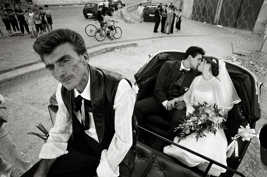 La selezione fotografica di Francesco Cito proviene dal progetto “Matrimoni Napoletani” (o “Neapolitan Wedding”), vincitore del prestigioso World Press Photo nel 1995 (categoria “Day in the Life”, 3° premio). Anche in questo caso, l’autore abbandona la monotonia della fotografia matrimoniale convenzionale per creare un linguaggio visivo nuovo, fortemente autoriale, che esplora le dinamiche sociali del matrimonio con occhio critico e riflessivo. L’approccio di Cito scompone il matrimonio tradizionale, come scritto da Michele Smargiassi nell’introduzione al libro Neapolitan Weddings, analizzando con precisione il meccanismo socio-antropologico di questo rito: “Sposarsi qui non è solo folclore ed esibizione. Non è solo un giorno speciale… Tutto il contrario, è la sospensione dell'ordinario, il trasferimento momentaneo ma radicale di un'intera comunità parentale, amicale, sociale in un'altra dimensione, senza più alcun rapporto con l'esistenza ordinaria di tutti. Cito affronta una ‘struttura’ possente, coerente, collaudata, funzionante: il moderno matrimonio foto-genico nella sua fenomenologia più completa e pura. E la de-struttura per comprenderla e smontarla con cura”.