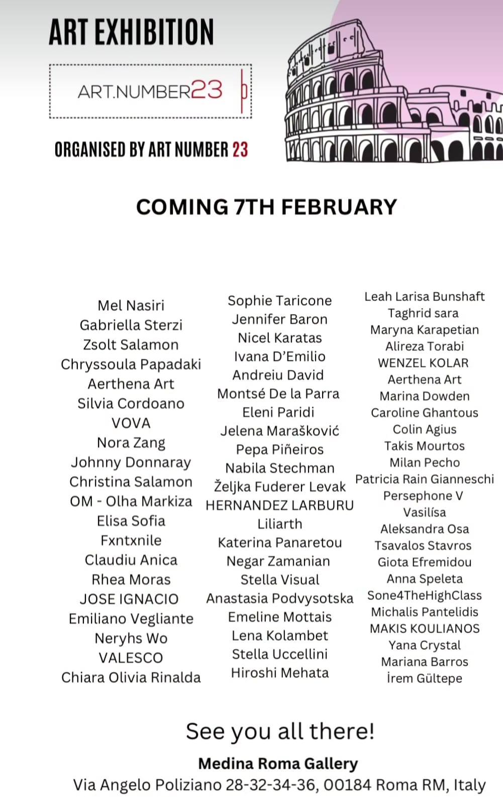 Dal 7 al 13 Febbraio 2025, Medina Roma Gallery ospiterà una mostra collettiva di artisti internazionali organizzata da Art Number 23, presso la sua sede nella Medina Roma Gallery, Via Angelo Poliziano 32-34