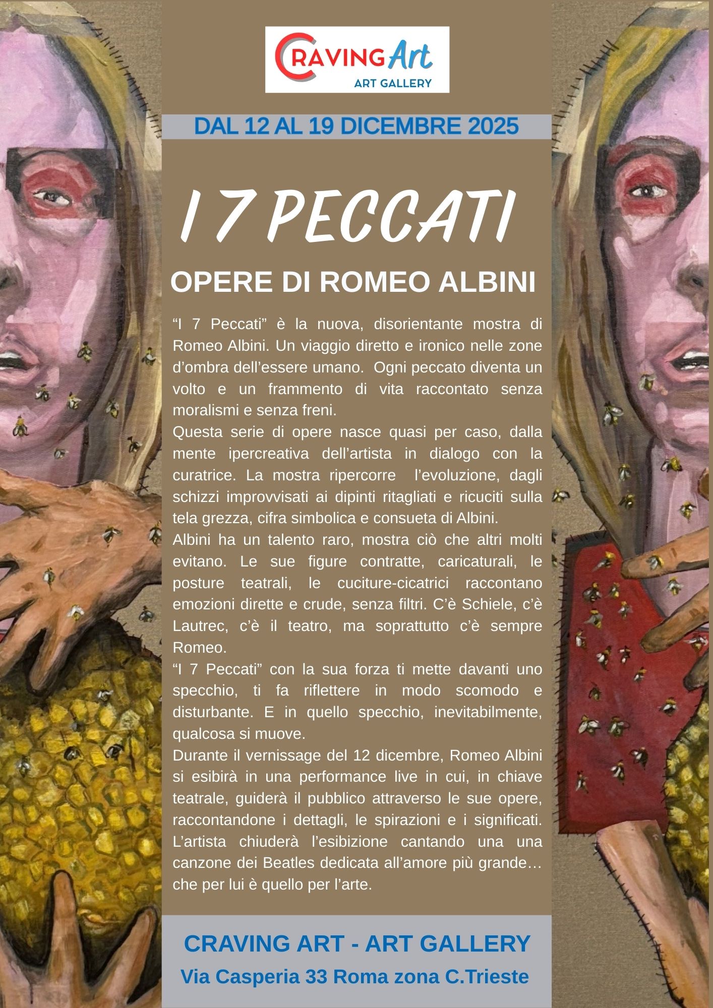 “I 7 Peccati” di Romeo Albini è una mostra intensa che esplora le zone oscure dell’essere umano attraverso sette opere rappresentanti i peccati capitali. Le figure caricaturali, spesso contratte e teatrali, sono dipinte su tele grezze, simbolo della tecnica unica dell’artista.
