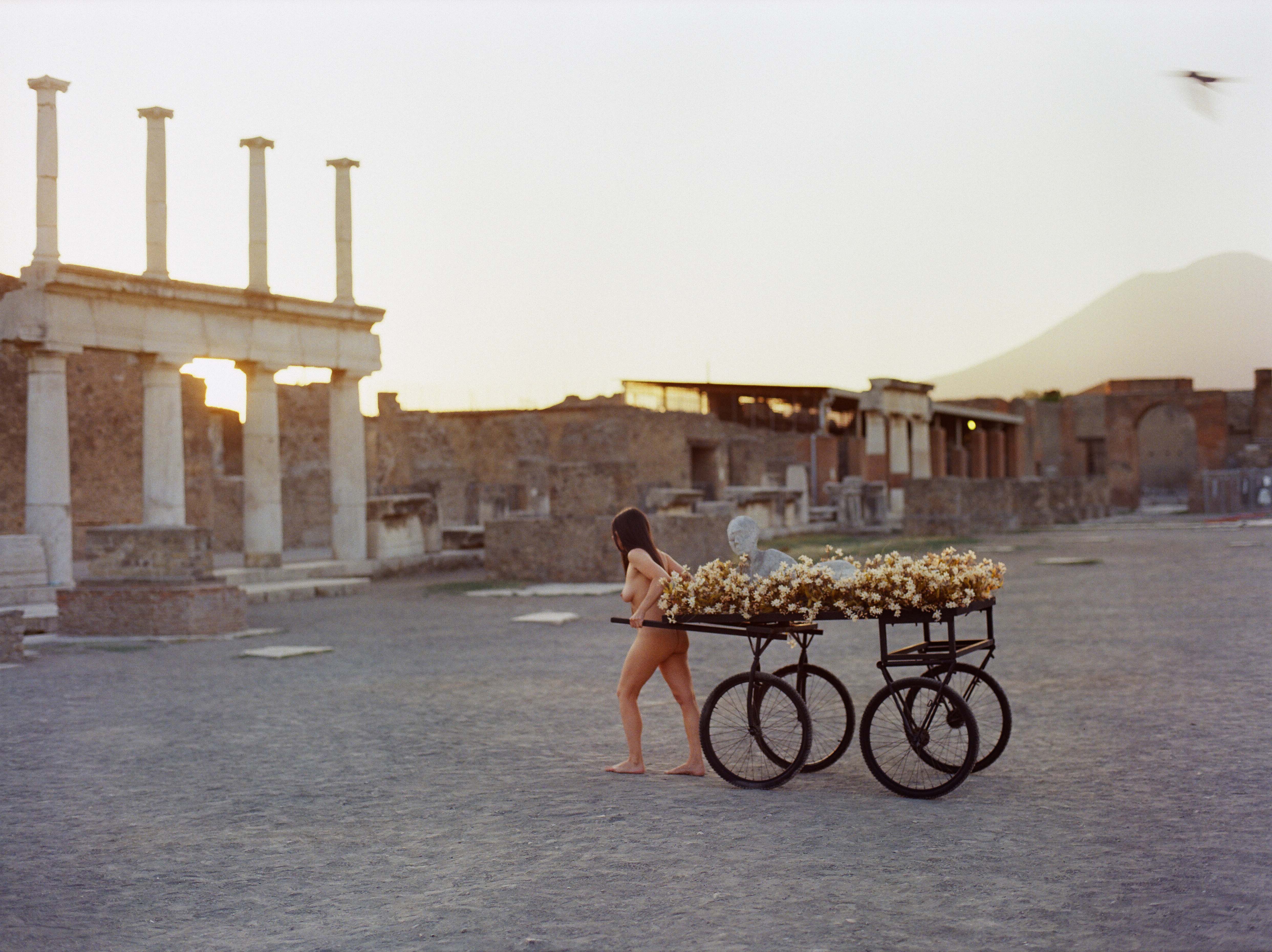 A partire dal 9 maggio nei prestigiosi spazi della DAFNA Gallery saranno esposte 7 foto di grande formato ed il video, elementi espositivi, tracce che narrano al pubblico la performance messa in atto nella notte tra il 9 ed il 10 giugno 2017 all’interno del Parco Archeologico di Pompei da Romina De Novellis, GRADIVA, l’allegoria dell’essere umano che trasporta, tra le rovine, la carcassa di se stesso lungo la tortuosa strada dell’esistenza. L’artista trascina a mano un grande carro di legno su cui è adagiato il calco in gesso del proprio corpo, che rimanda direttamente ai calchi di Pompei, mentre sullo sfondo si ergono le antiche rovine della città sepolta nel pieno della propria vitalità, in un percorso che si snoda attraverso le strade dove sorgevano le ville, le abitazioni comuni, le antiche botteghe, i luoghi di ristoro e gli spazi dedicati al culto.