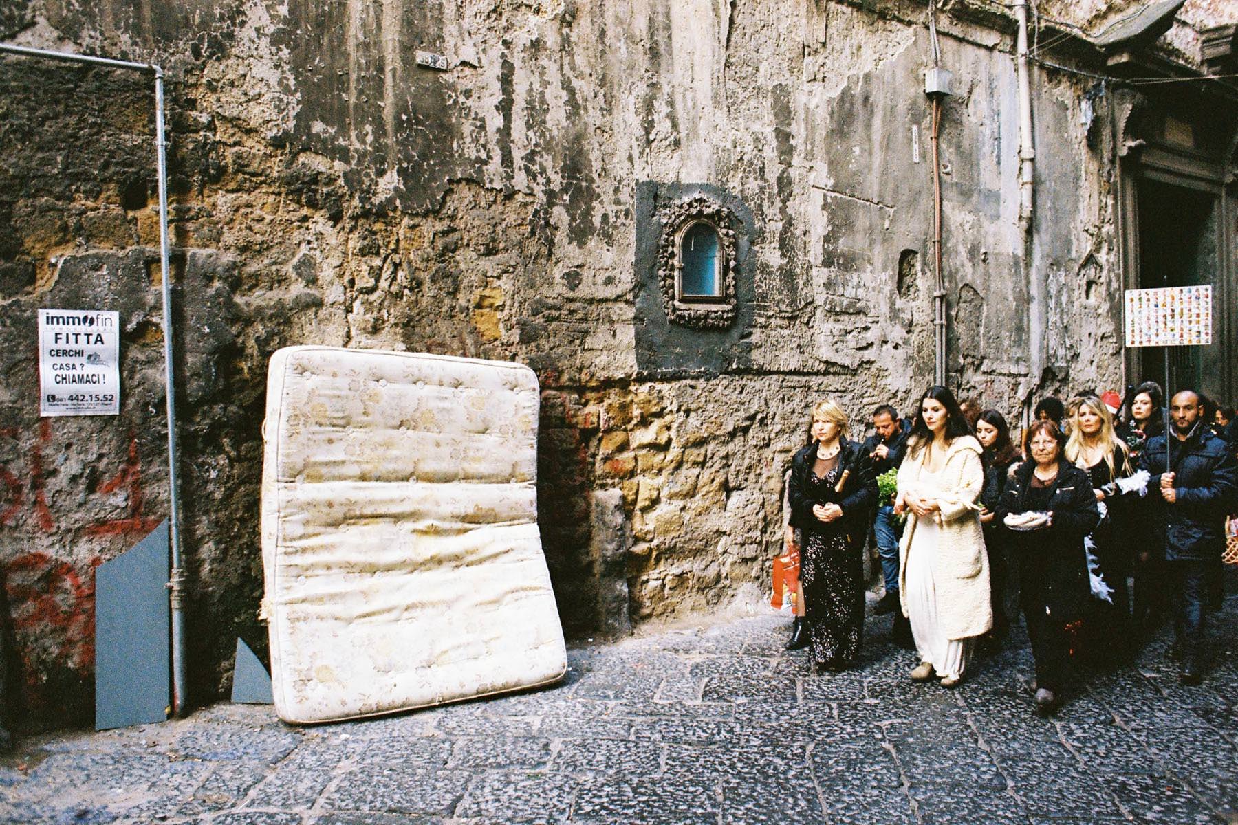 Un lungo corteo, un grande flusso di emozioni che ha toccato i luoghi più significativi della realtà culturale partenopea, contemporanea e popolare, partito dal Museo Archeologico Nazionale fine dentro il cuore della Napoli antica, passando per il museo MADRE, per proseguire lungo San Biagio dei Librai, Spaccanapoli, piazza Plebiscito e giungere fino al mare, vero luogo e momento simbolico della performance, dove l’atto di immersione in esso da parte dei partecipanti vuole essere un modo di raccontare l’espiazione, la catarsi, l’abbandono come temi strettamente connessi alla sfera intima del singolo.