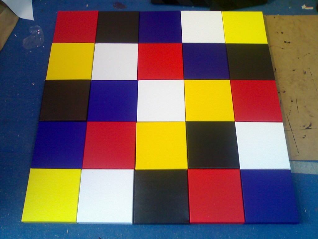 La Ambrogi così commenta: “L’unica opera colorata esposta in sala in maniera esemplare e suggestiva traduce con le tele le caselle di un reticolo didattico pensato da Itten che spiega l’esaltazione dei colori mediante i contrasti di colori puri a suggellare quanto la teoria e la scienza siano fondamentali anche per prodotti che si sostanziano nella creatività”.