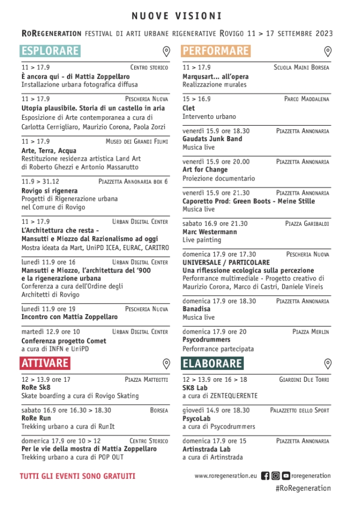 Dall’11 al 17 settembre 2023 si svolge a Rovigo il festival “RoRegeneration”, una settimana di eventi per favorire nuovi modi di percepire e vivere la propria città, tra fotografia, arte contemporanea, installazioni, street art, live painting, set musicali, un documentario, incontri, laboratori.