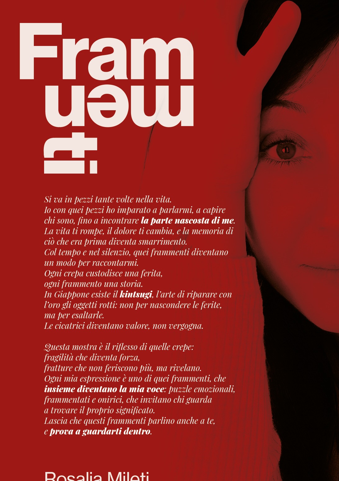 Ogni crepa custodisce una ferita, ogni frammento una storia. In Giappone esiste il kintsugi, l’arte di riparare con l’oro gli oggetti rotti: non per nascondere le ferite, ma per esaltarle. Le cicatrici diventano valore, non vergogna. Questa mostra è il riflesso di quelle crepe: fragilità che diventa forza, fratture che non feriscono più, ma rivelano. Ogni mia espressione è uno di quei frammenti, che insieme diventano la mia voce: puzzle emozionali, frammenti e onirici, che invitano chi guarda a trovare il proprio significato.