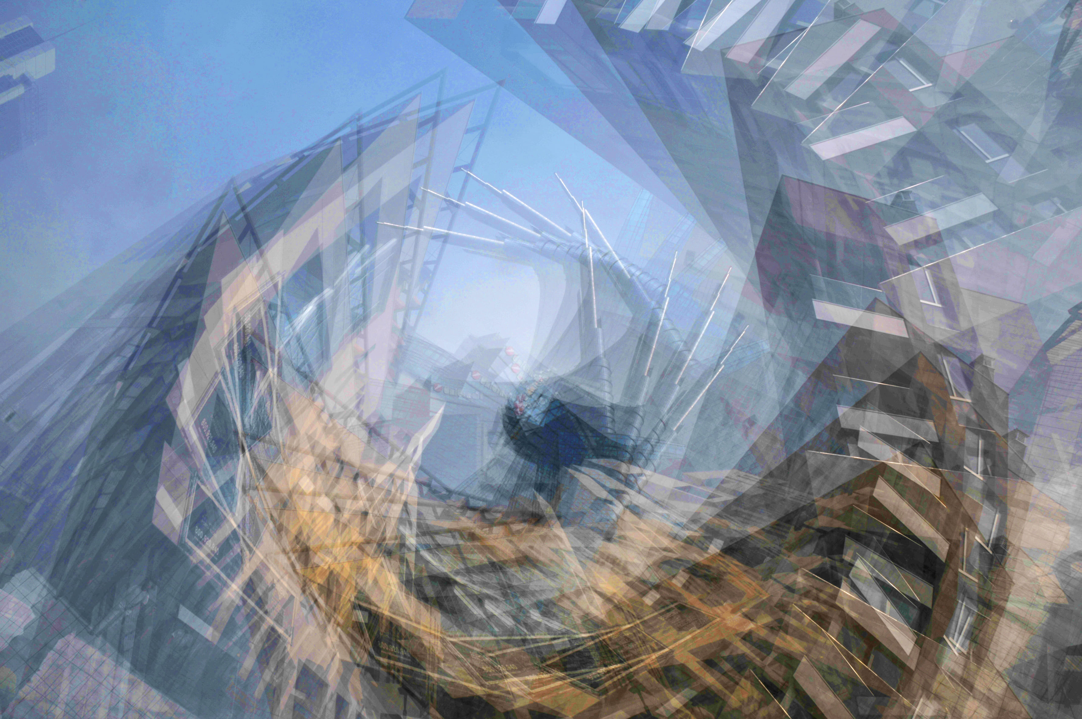 Possiamo partire dalle fotografie dinamiche di luoghi, di edifici o di monumenti, i cui risultati rimandano in ambito futurista, che egli sviluppa mediante delle esposizioni multiple calibrate (8 scatti in sequenza circolare) da cui prende corpo una girandola di forme-colori che avvince l’occhio di chi guarda trasformando la rappresentazione in un gorgo che può avere effetto a volte centripeto e altre centrifugo. Una visione aerea, potremmo dire, che stravolge la staticità dei luoghi e li rende protagonisti di una realtà assoluta (astratta potremmo dire) in rigoroso e intrigante divenire.