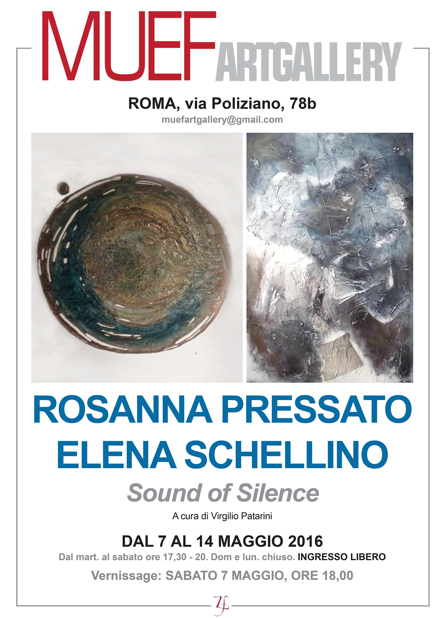 Si inaugura sabato 7 maggio 2016 alle ore 18,00 alla MUEF ArtGallery di Roma, via Angelo Poliziano, 78b, la mostra bi-personale di pittura di Rosanna Pressato ed Elena Schellino intitolata “Sound of Silence”, a cura di Virgilio Patarini, con la collaborazione di Roberta Sole, Francesco Giulio Farachi e Maurizio Bedini. Organizzazione Zamenhof Art.